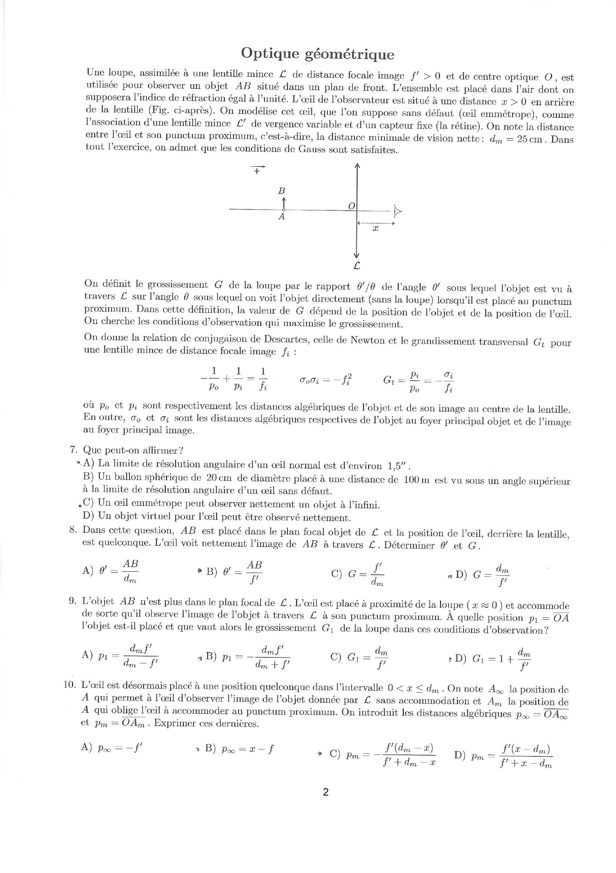 Une loupe, assimilée à une lentille mince de distance focale image et de centre optique , est utilisée pour observer un objet situé dans un plan de front. L'ensemble est placé dans l'air dont on supposera l'indice de réfraction égal à l'unité. L'oeil de l'observateur est situé à une distance en arrière de la lentille (Fig. ci-après). On modélise cet œil, que l'on suppose sans défaut (œil emmétrope), comme l'association d'une lentille mince de vergence variable et d'un capteur fixe (la rétine). On note la distance entre l'œil et son punctum proximum, c'est-à-dire, la distance minimale de vision nette: . Dans tout l'exercice, on admet que les conditions de Gauss sont satisfaites.