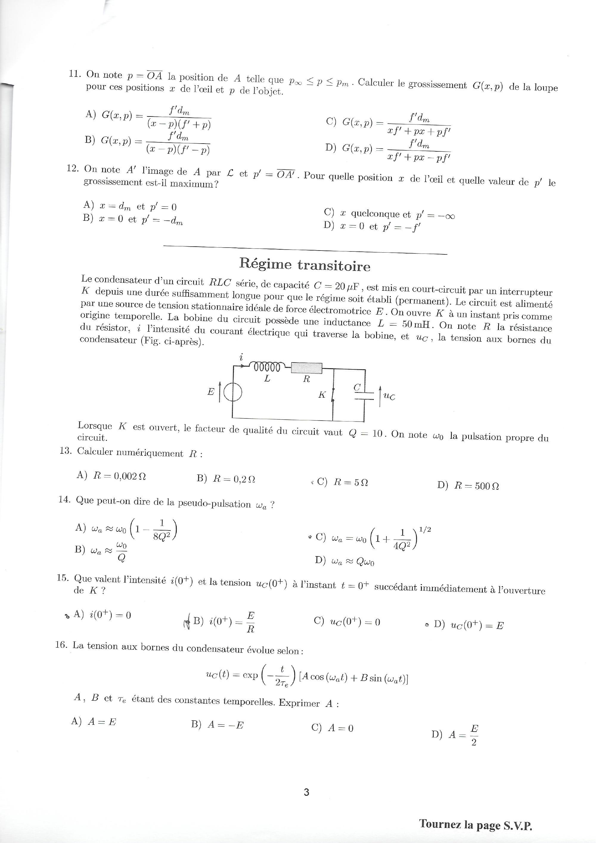 18. On attend suffisamment longtemps que le régime s'établisse puis, à un instant pris comme nouvelle origine temporelle, on ferme . On retiendra, par convention, comme durée du régime transitoire, la durée nécessaire pour que atteignent de sa valeur finale (on indique que ). Déterminer la durée du régime transitoire succédant à la fermeture de .
