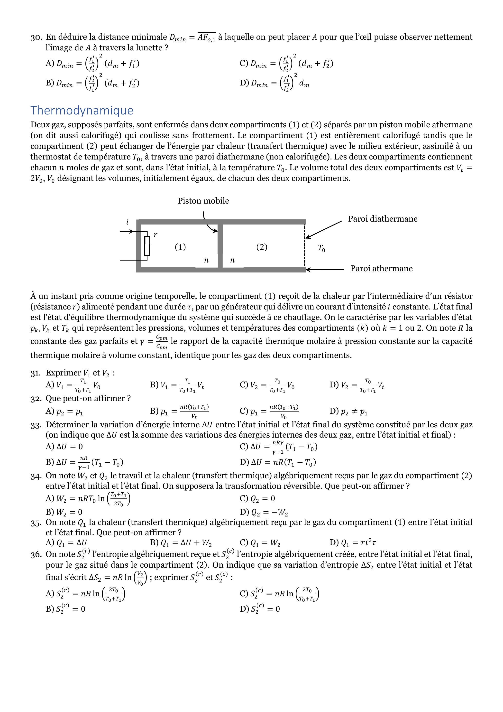 Deux gaz, supposés parfaits, sont enfermés dans deux compartiments (1) et (2) séparés par un piston mobile athermane (on dit aussi calorifugé) qui coulisse sans frottement. Le compartiment (1) est entièrement calorifugé tandis que le compartiment (2) peut échanger de l'énergie par chaleur (transfert thermique) avec le milieu extérieur, assimilé à un thermostat de température , à travers une paroi diathermane (non calorifugée). Les deux compartiments contiennent chacun moles de gaz et sont, dans l'état initial, à la température . Le volume total des deux compartiments est désignant les volumes, initialement égaux, de chacun des deux compartiments.