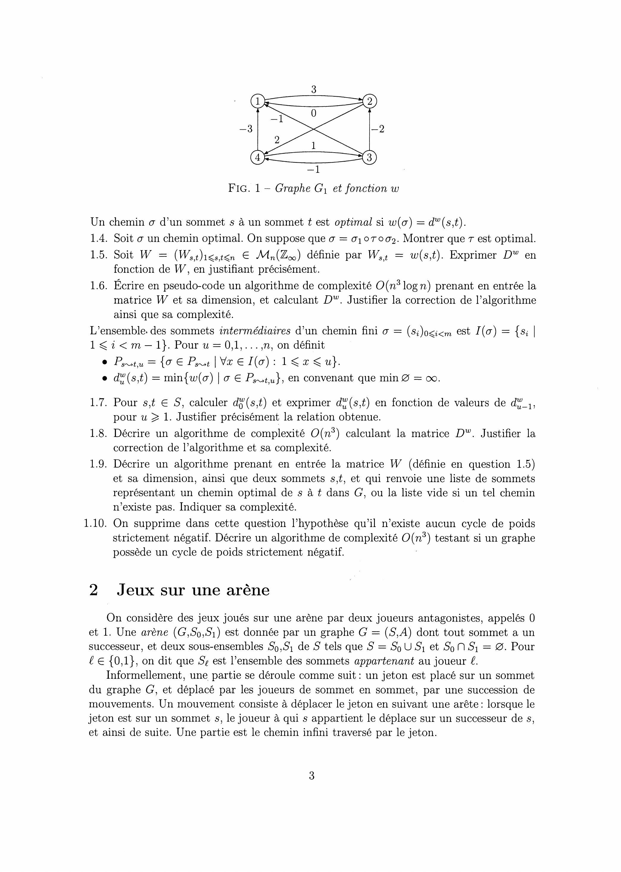 Ce problème s'intéresse au calcul de chemins optimaux dans un graphe fini et orienté, puis aux stratégies dans un jeu à information parfaite, joué par deux joueurs antagonistes déplaçant sur un tel graphe un jeton de sommet en sommet, suivant les arêtes. Les sections 1 et 2 sont largement indépendantes l'une de l'autre. Il en est de même pour les sections 2.2 et 2.3 .