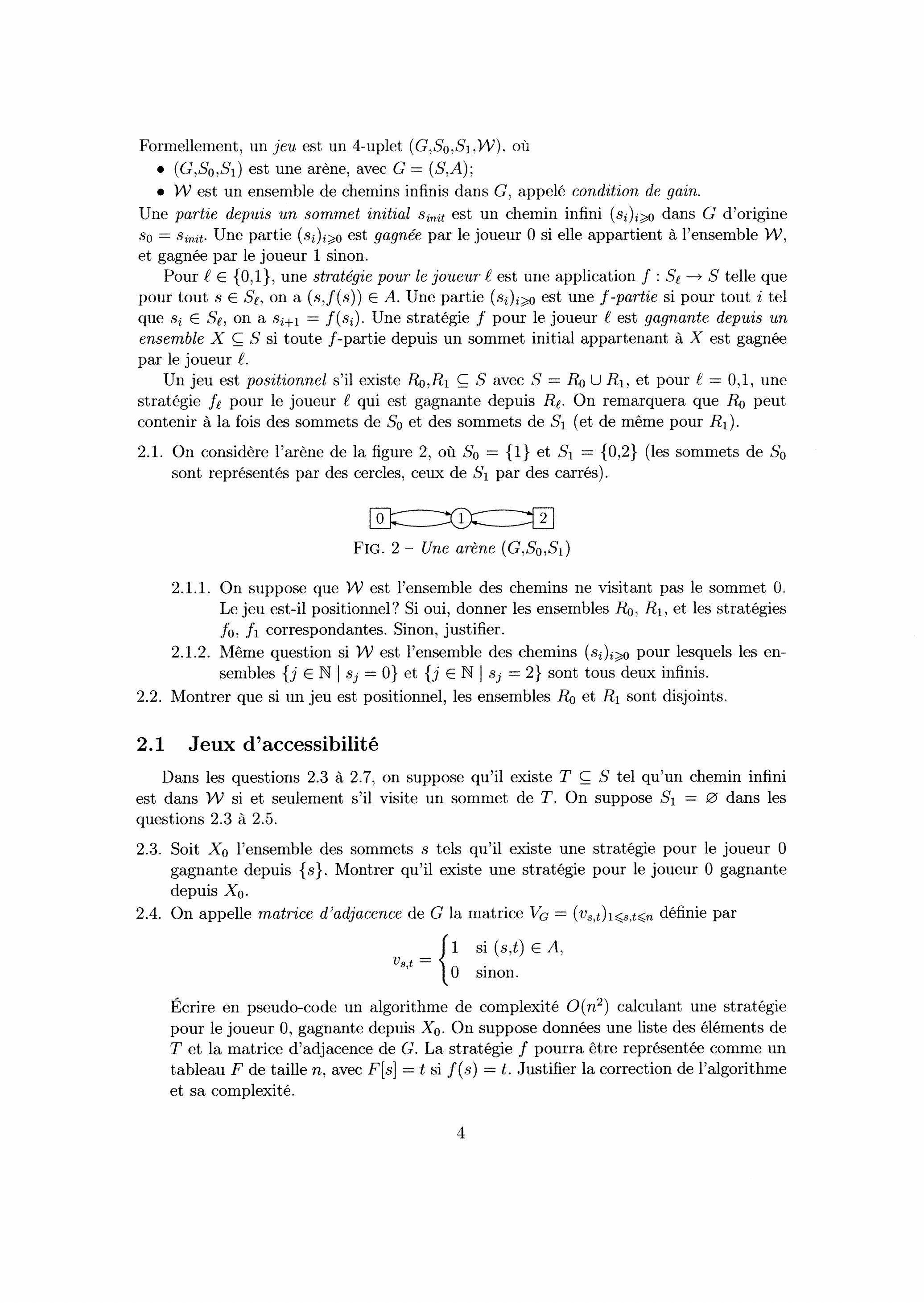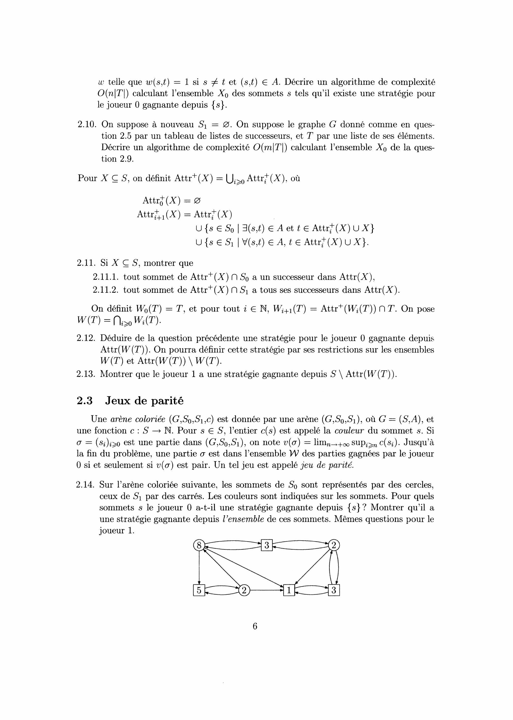 2.20. Décrire un algorithme de complexité , où pour calculer des ensembles tels que , ainsi que deux stratégies et pour les joueurs 0 et 1 respectivement, telles que soit gagnante depuis et le soit depuis .