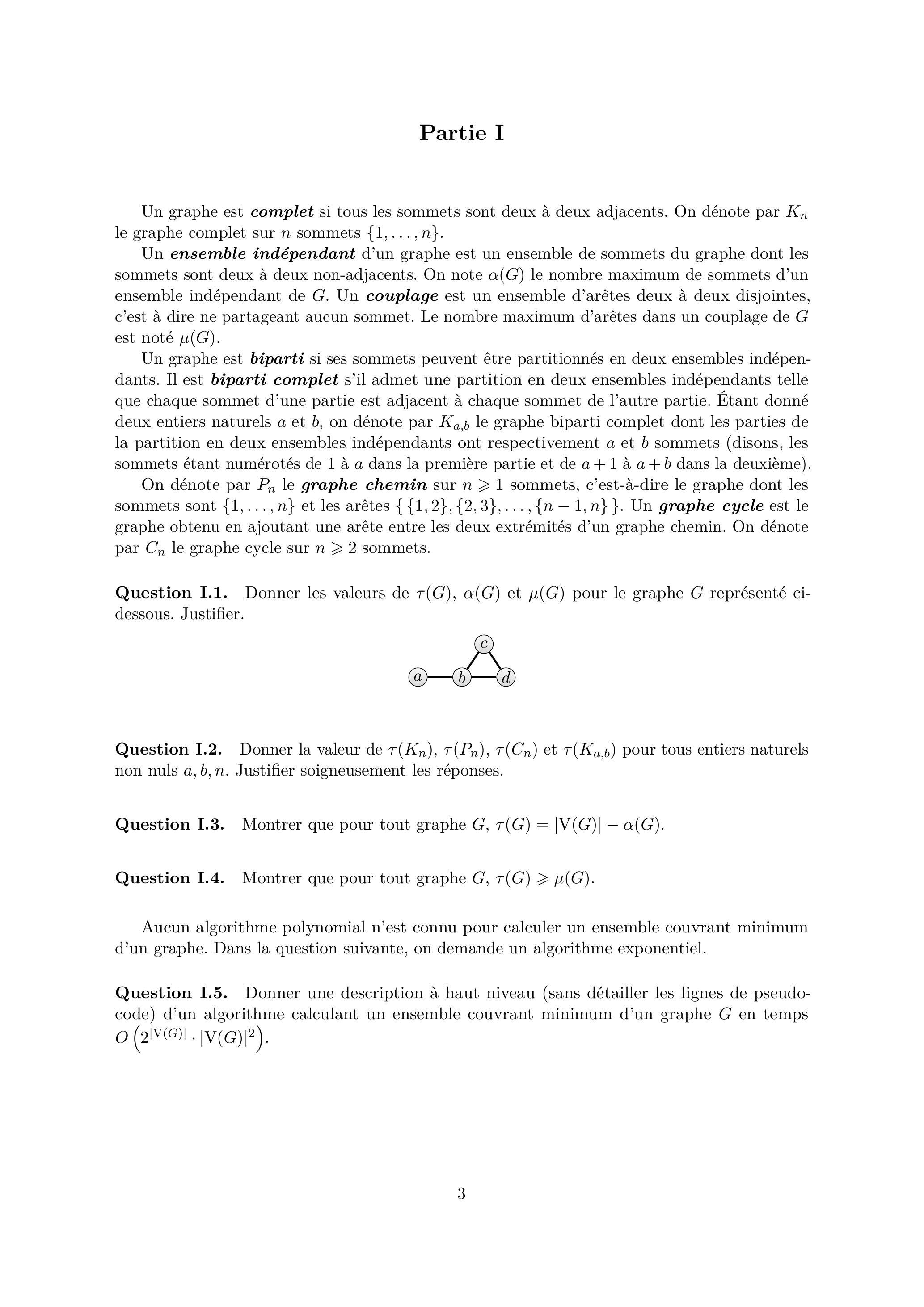 Question I.5. Donner une description à haut niveau (sans détailler les lignes de pseudocode) d'un algorithme calculant un ensemble couvrant minimum d'un graphe en temps .