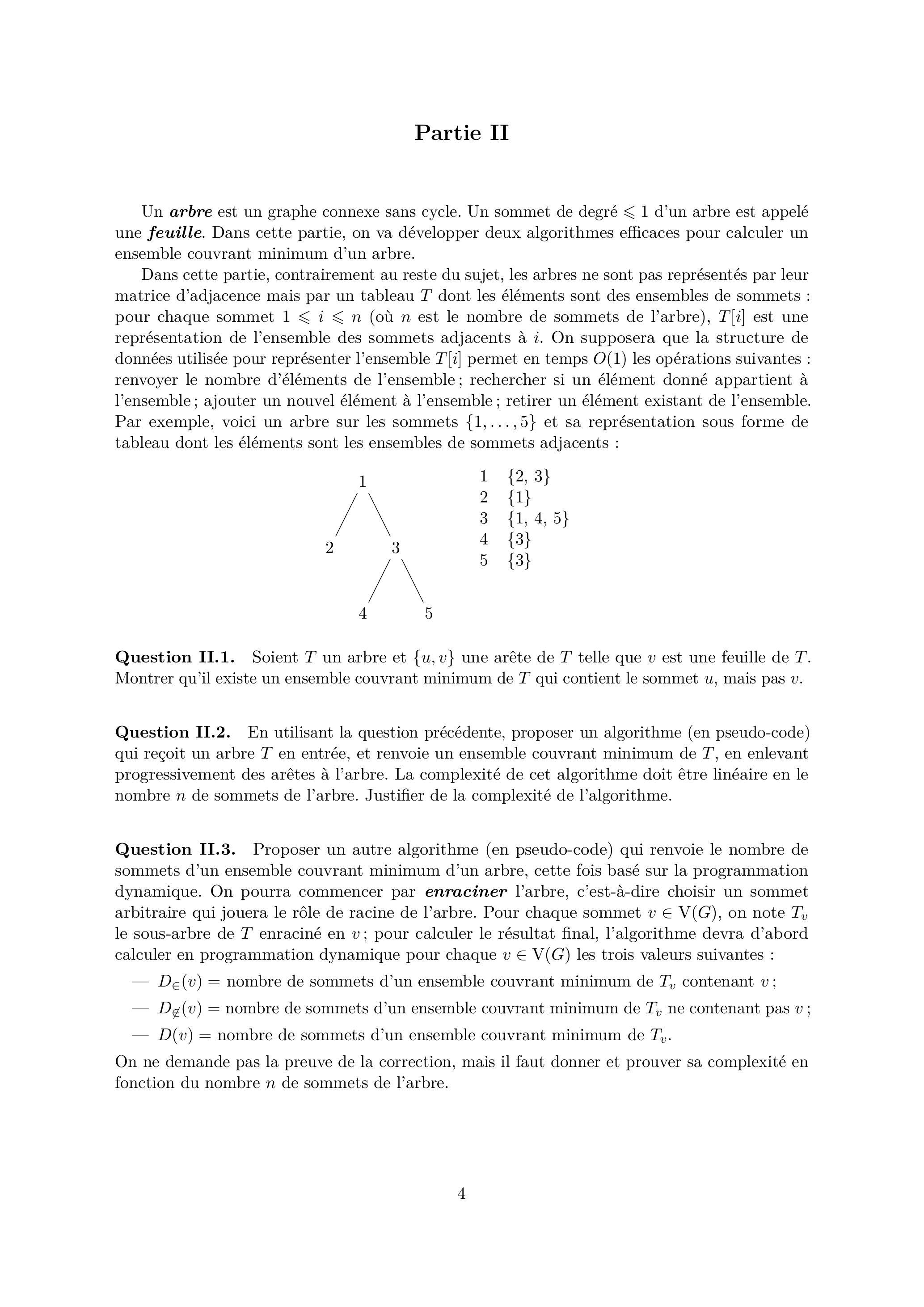 Question II.2. En utilisant la question précédente, proposer un algorithme (en pseudo-code) qui reçoit un arbre en entrée, et renvoie un ensemble couvrant minimum de , en enlevant progressivement des arêtes à l'arbre. La complexité de cet algorithme doit être linéaire en le nombre de sommets de l'arbre. Justifier de la complexité de l'algorithme.
