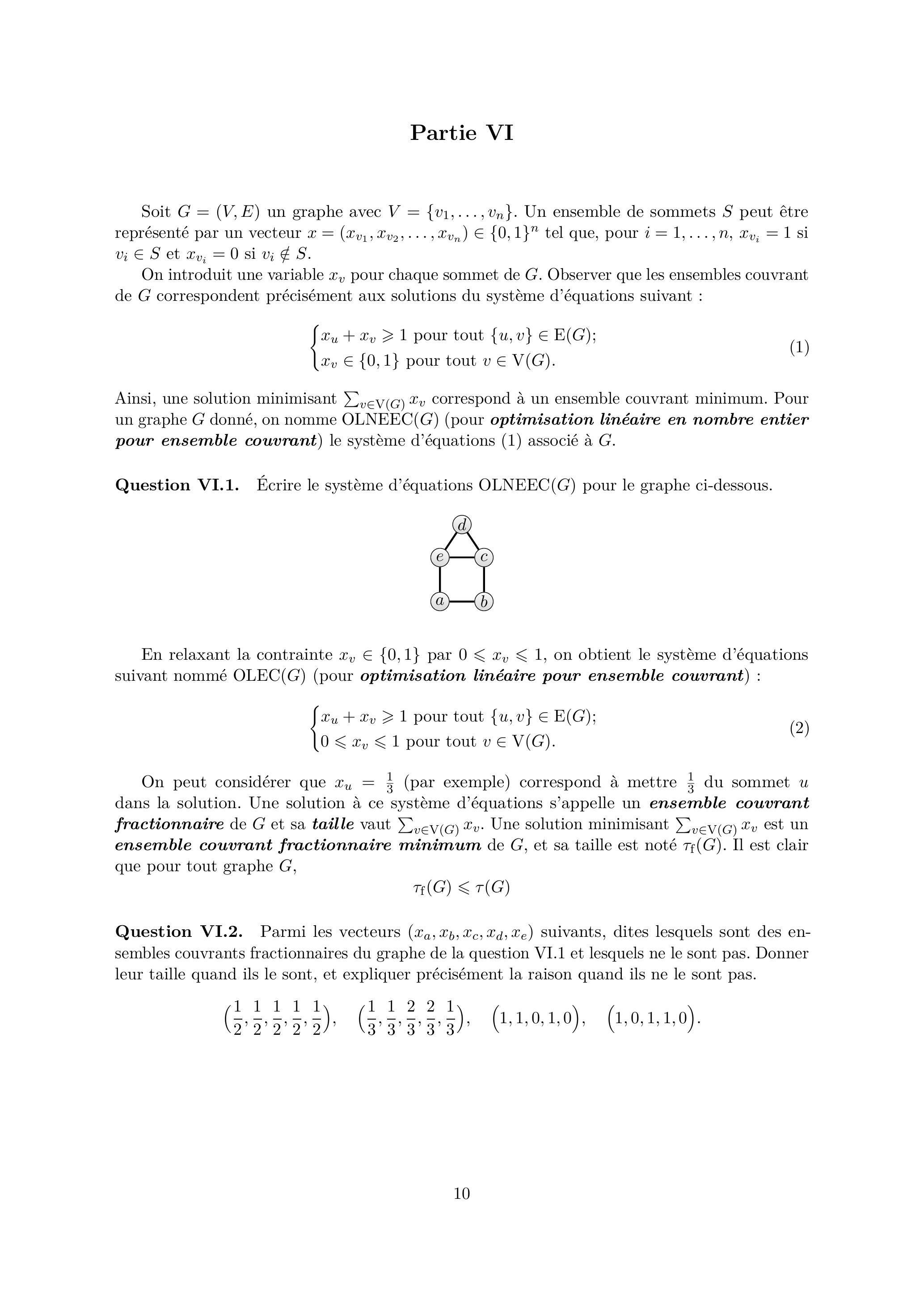 Question VI.5. Montrer que est un ensemble couvrant de et que . On admettra qu'il existe un algorithme en temps polynomial permettant de trouver un ensemble couvrant fractionnaire minimum. En déduire un algorithme polynomial qui donne une 2approximation pour le problème de l'ensemble couvrant minimum.