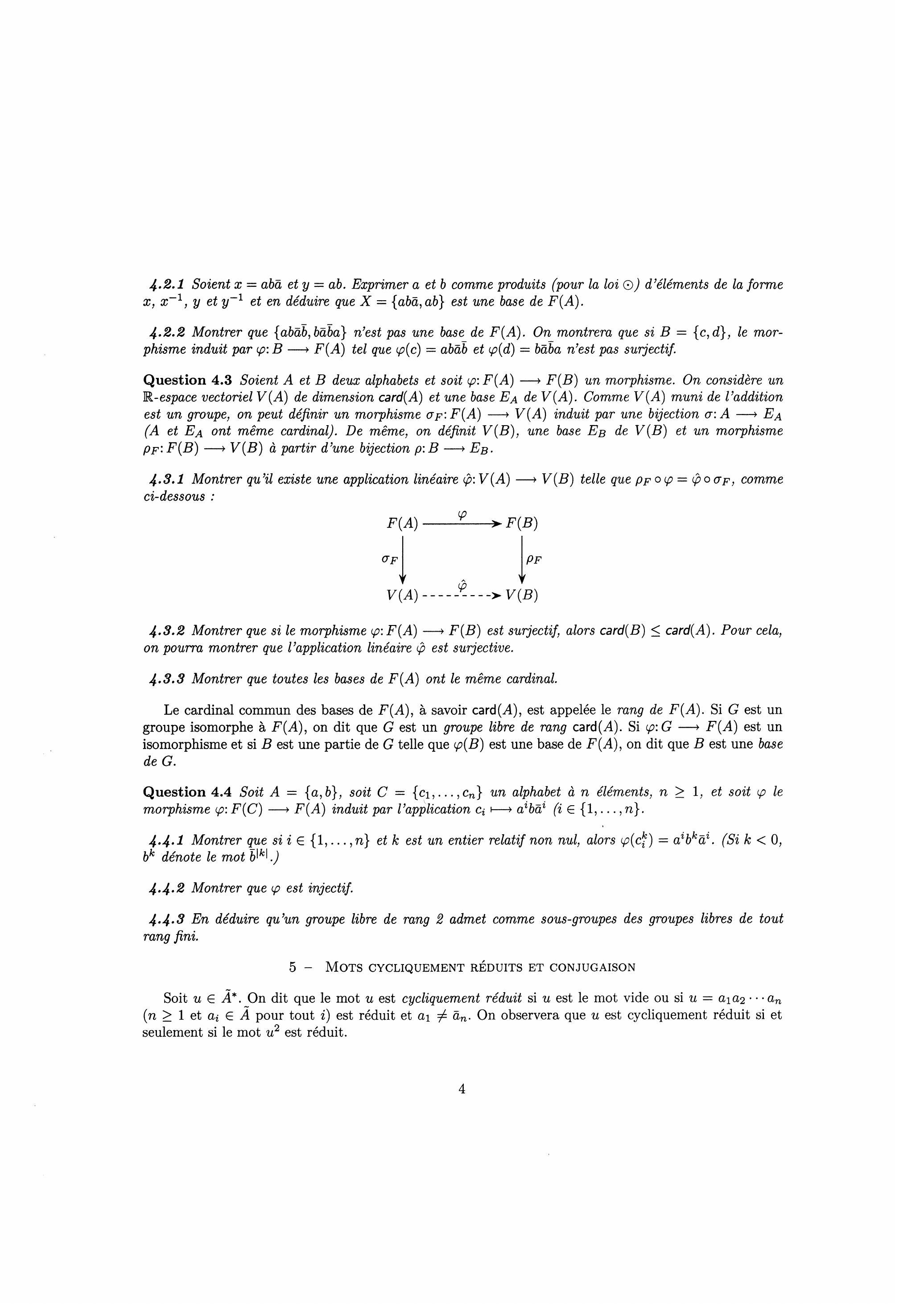 Dans la situation de la question 3.3, on dit que le morphisme est induit par l'application , ou qu'il la prolonge. Dans la suite, on utilisera librement le résultat de cette question : toute application de dans un groupe induit un unique morphisme de dans .