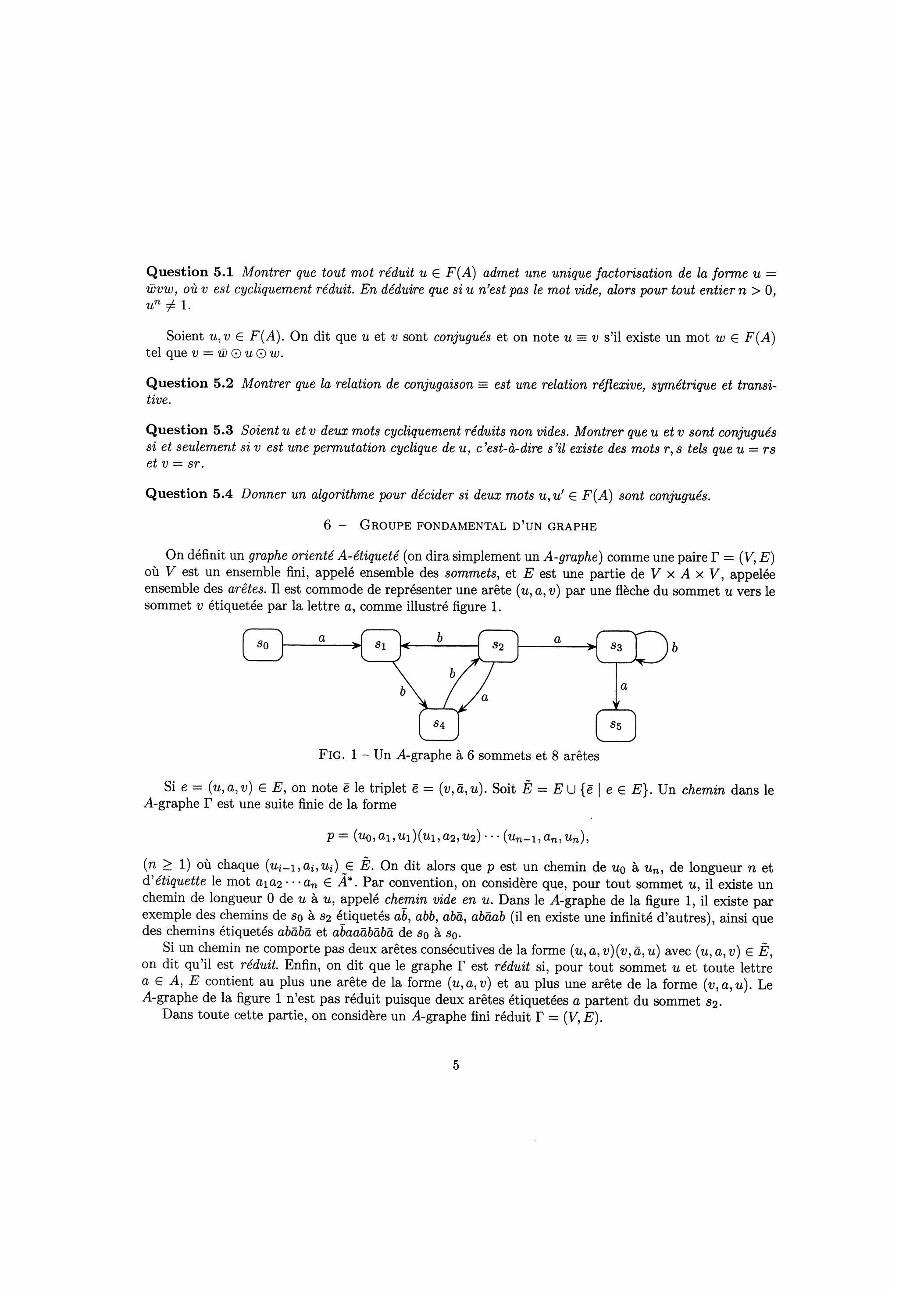 Question 5.3 Soient et deux mots cycliquement réduits non vides. Montrer que u et v sont conjugués si et seulement si est une permutation cyclique de , c'est-à-dire s'il existe des mots tels que et .