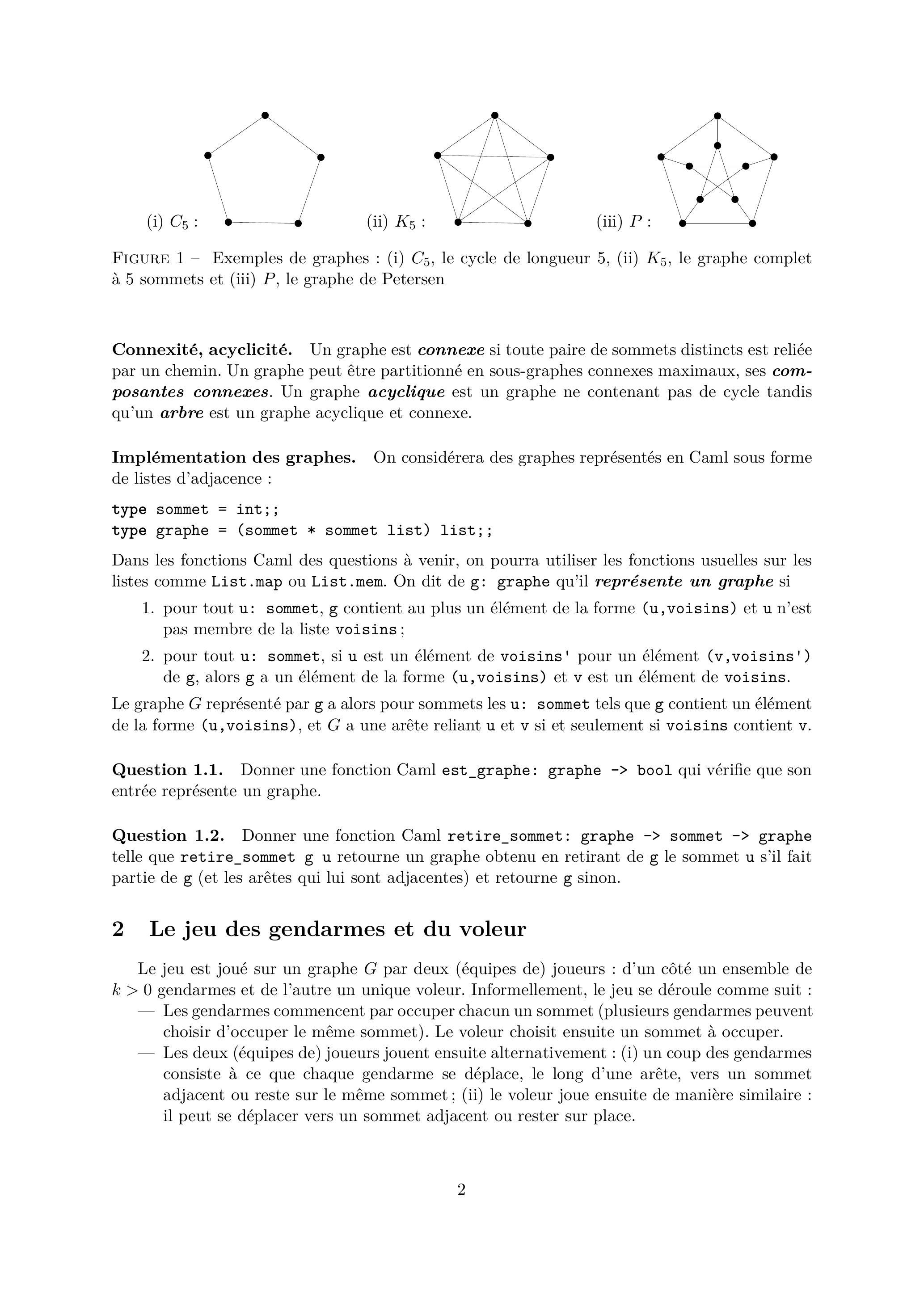 Dans ce sujet, on s'intéresse à un jeu à deux joueurs qui se joue sur des graphes, le jeu des gendarmes et du voleur. Le sujet est organisé comme suit :