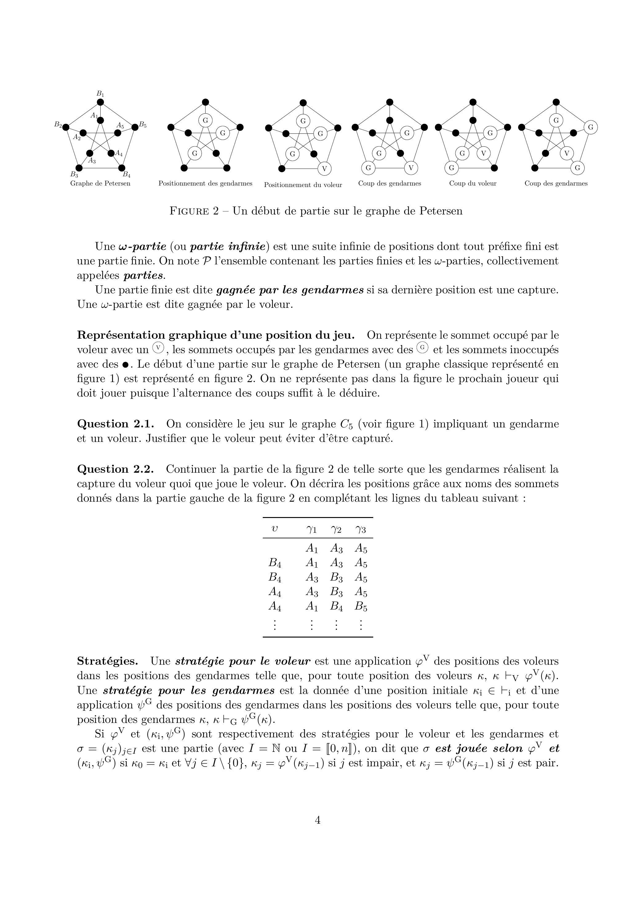 • La partie 3 étudie le jeu dans le cas où il n'y a qu'un seul gendarme : elle propose d'établir une caractérisation des graphes où le gendarme possède une stratégie gagnante.