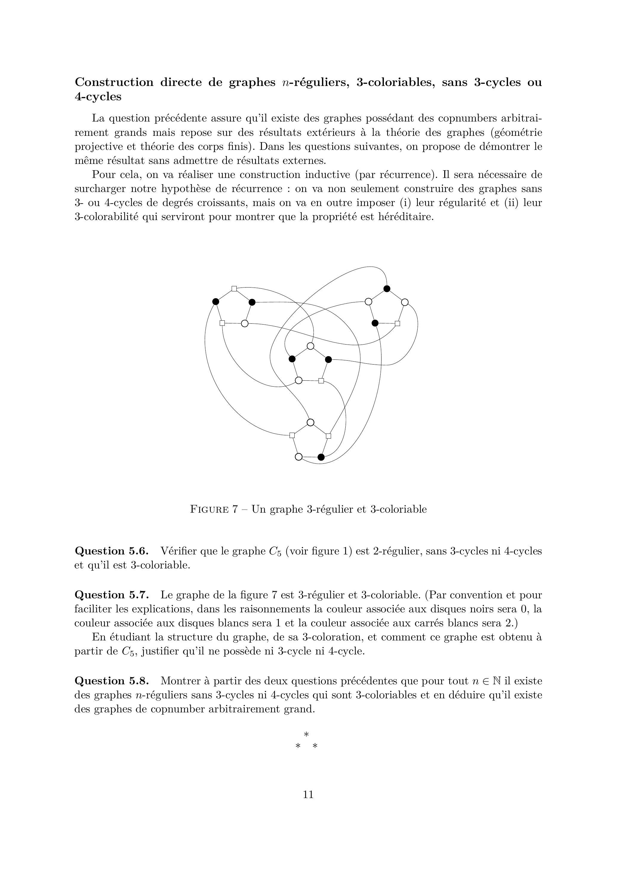 Question 5.8. Montrer à partir des deux questions précédentes que pour tout il existe des graphes -réguliers sans 3 -cycles ni 4 -cycles qui sont 3 -coloriables et en déduire qu'il existe des graphes de copnumber arbitrairement grand.