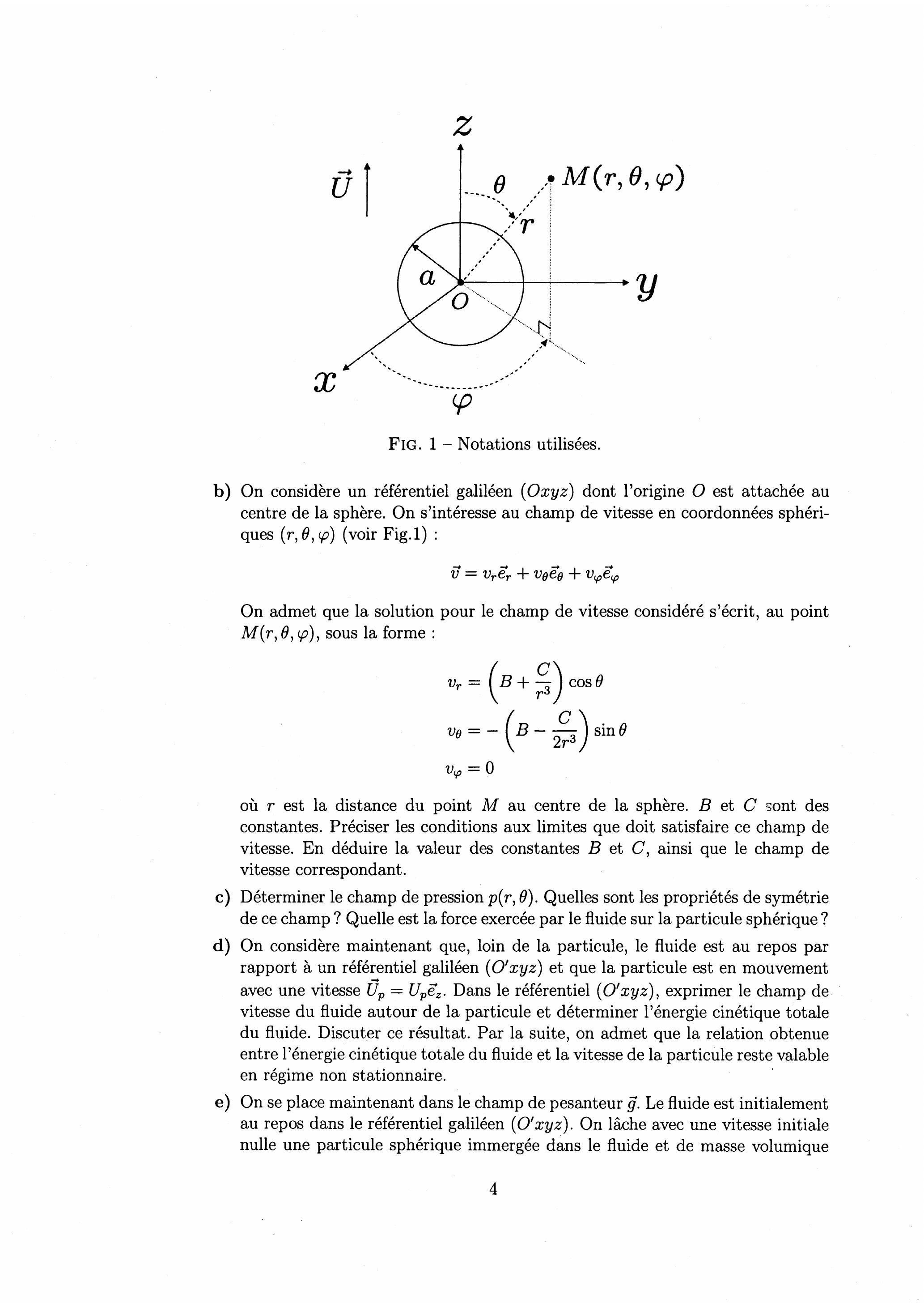 b) On considère un référentiel galiléen ( ) dont l'origine est attachée au centre de la sphère. On s'intéresse au champ de vitesse en coordonnées sphériques (voir Fig.1) :