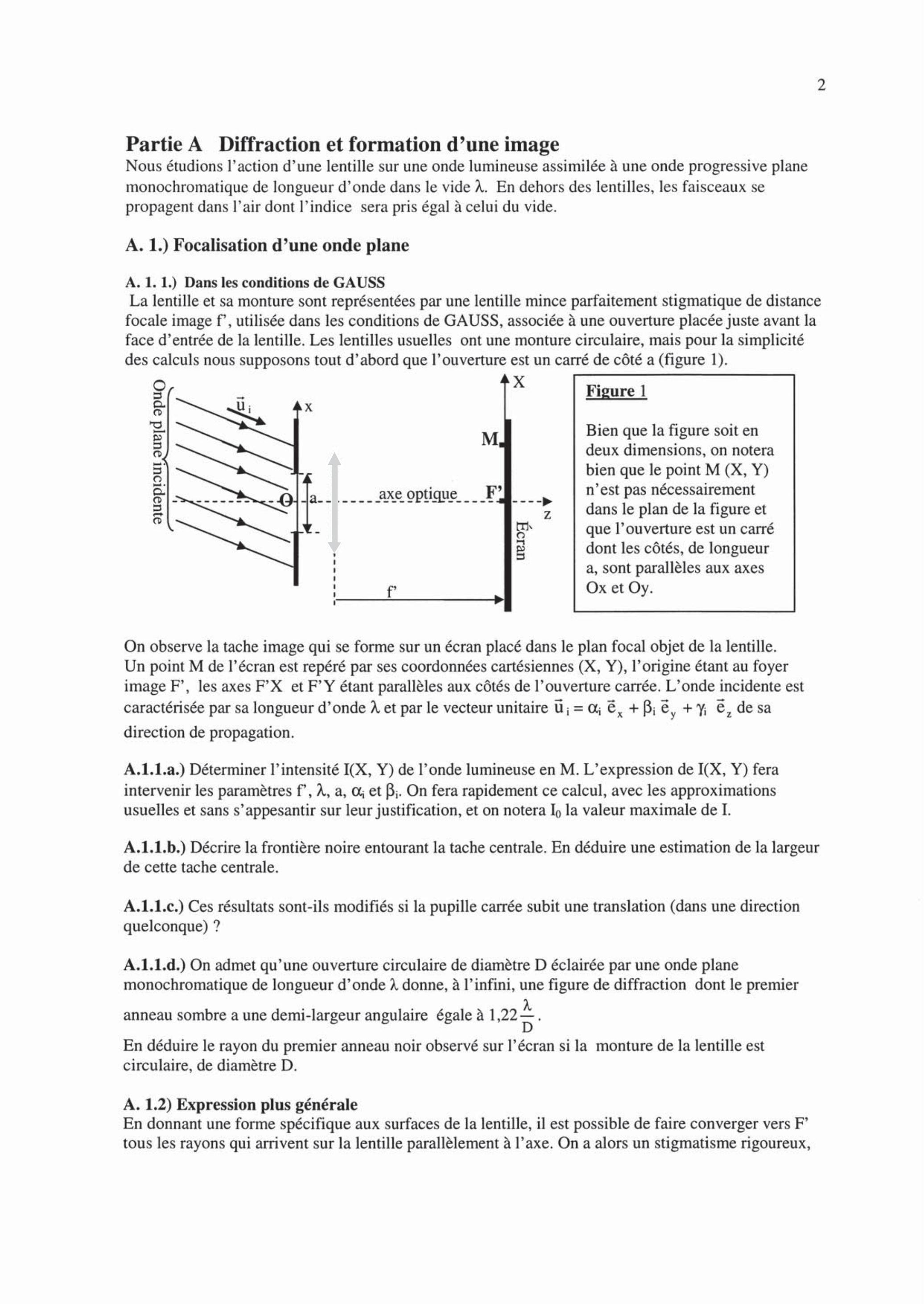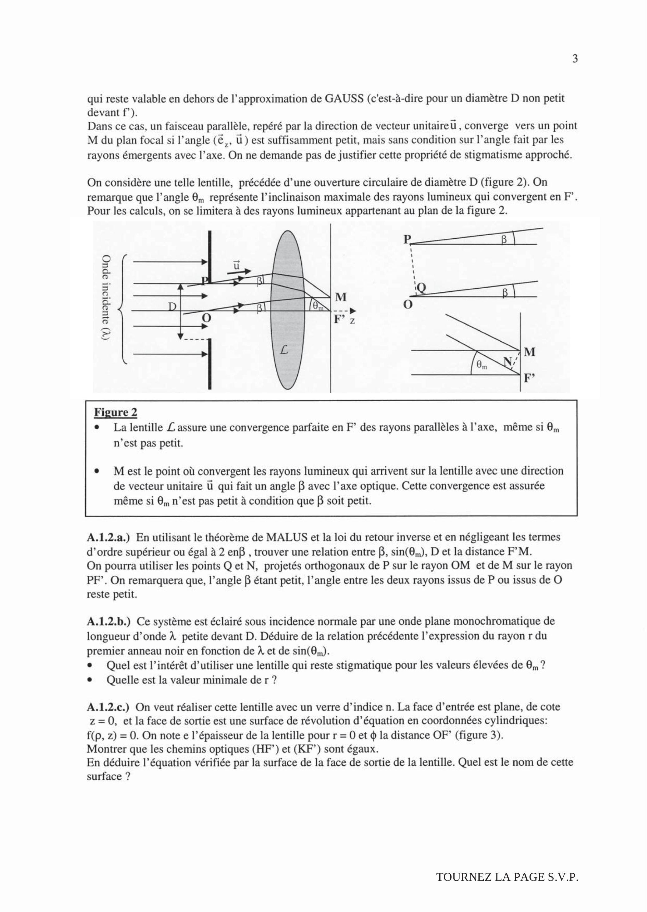 Dans ce cas, un faisceau parallèle, repéré par la direction de vecteur unitaire , converge vers un point M du plan focal si l'angle ( ) est suffisamment petit, mais sans condition sur l'angle fait par les rayons émergents avec l'axe. On ne demande pas de justifier cette propriété de stigmatisme approché.