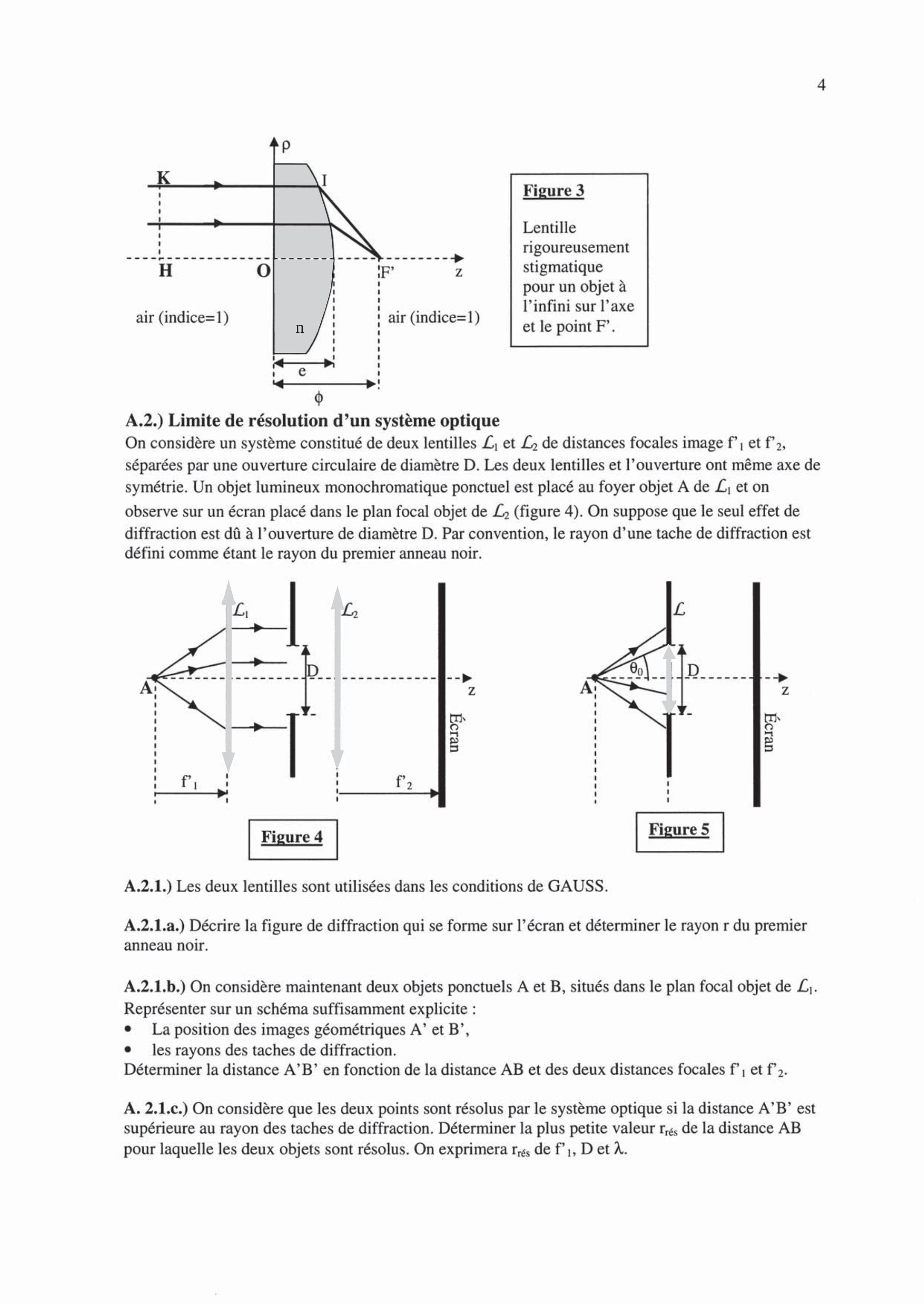 On considère un système constitué de deux lentilles et de distances focales image f'' et f' , séparées par une ouverture circulaire de diamètre D . Les deux lentilles et l'ouverture ont même axe de symétrie. Un objet lumineux monochromatique ponctuel est placé au foyer objet A de et on observe sur un écran placé dans le plan focal objet de (figure 4). On suppose que le seul effet de diffraction est dû à l'ouverture de diamètre D . Par convention, le rayon d'une tache de diffraction est défini comme étant le rayon du premier anneau noir.