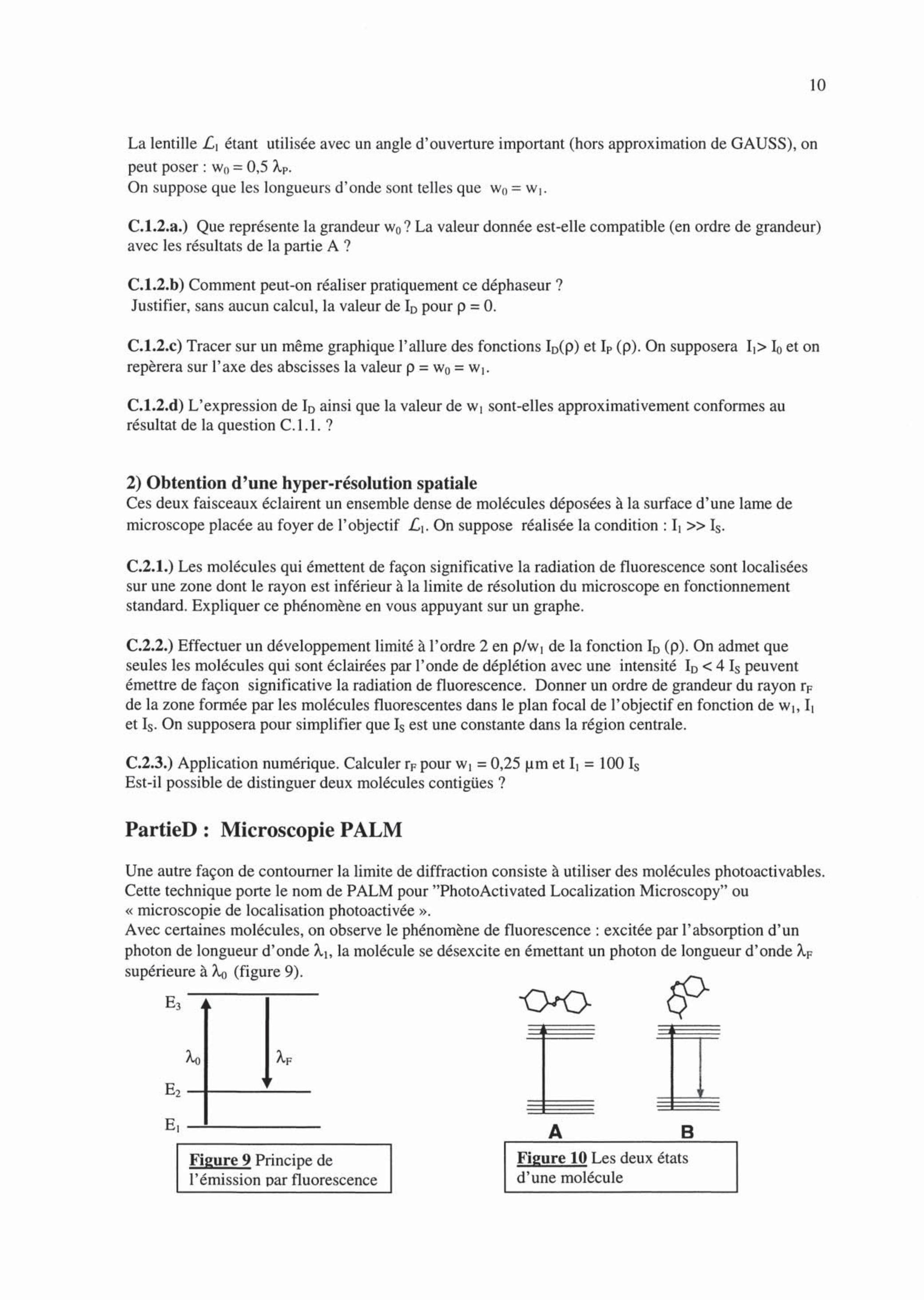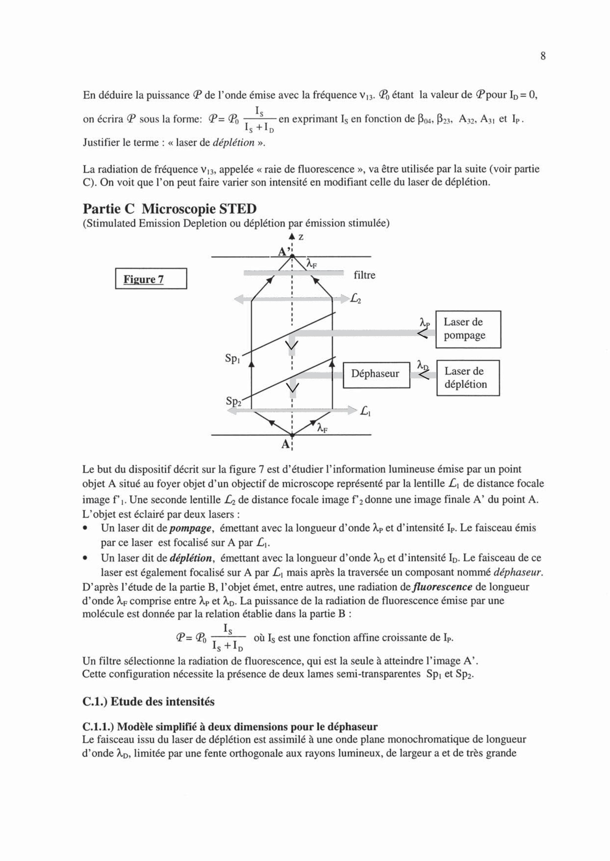 Un laser dit de déplétion, émettant avec la longueur d'onde et d'intensité . Le faisceau de ce laser est également focalisé sur A par mais après la traversée un composant nommé déphaseur. D'après l'étude de la partie B, l'objet émet, entre autres, une radiation de fluorescence de longueur d'onde comprise entre et . La puissance de la radiation de fluorescence émise par une molécule est donnée par la relation établie dans la partie B :