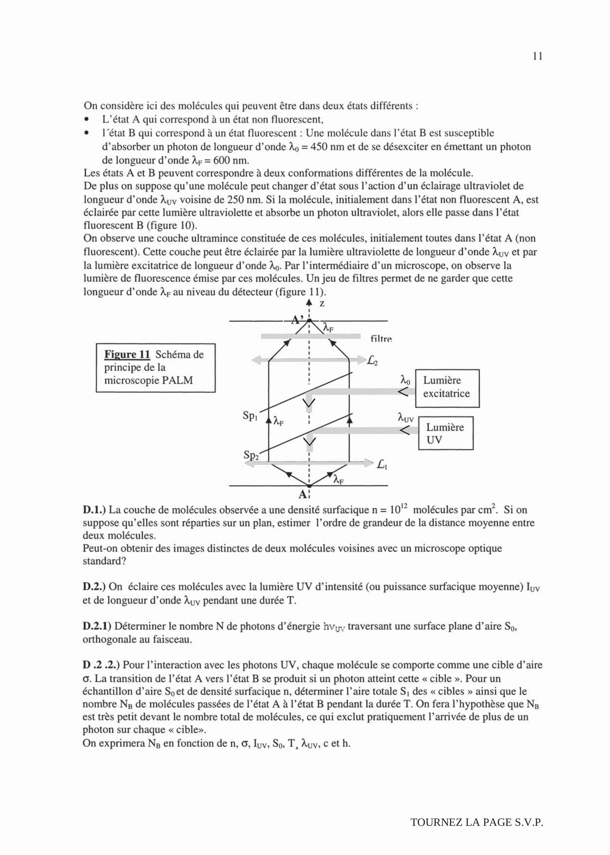D.2.3.) Calculer la durée T nécessaire pour obtenir une densité surfacique de molécules photoactivées dans l'état B égale à molécules par . On donne : , ,