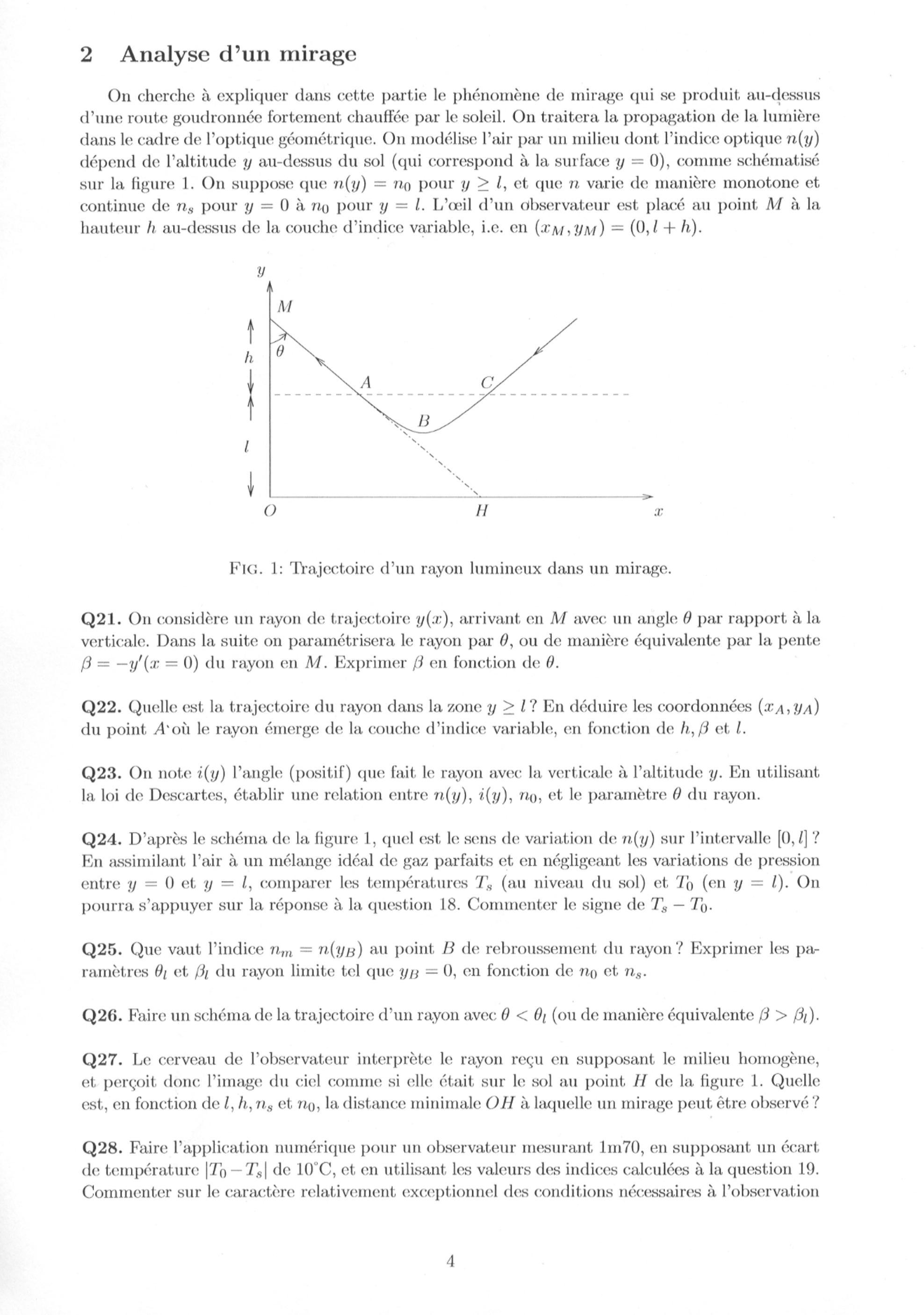 Q27. Le cerveau de l'observateur interprète le rayon reçu en supposant le milieu homogène, et perçoit donc l'image du ciel comme si elle était sur le sol au point de la figure 1. Quelle est, en fonction de et , la distance minimale à laquelle un mirage peut être observé?