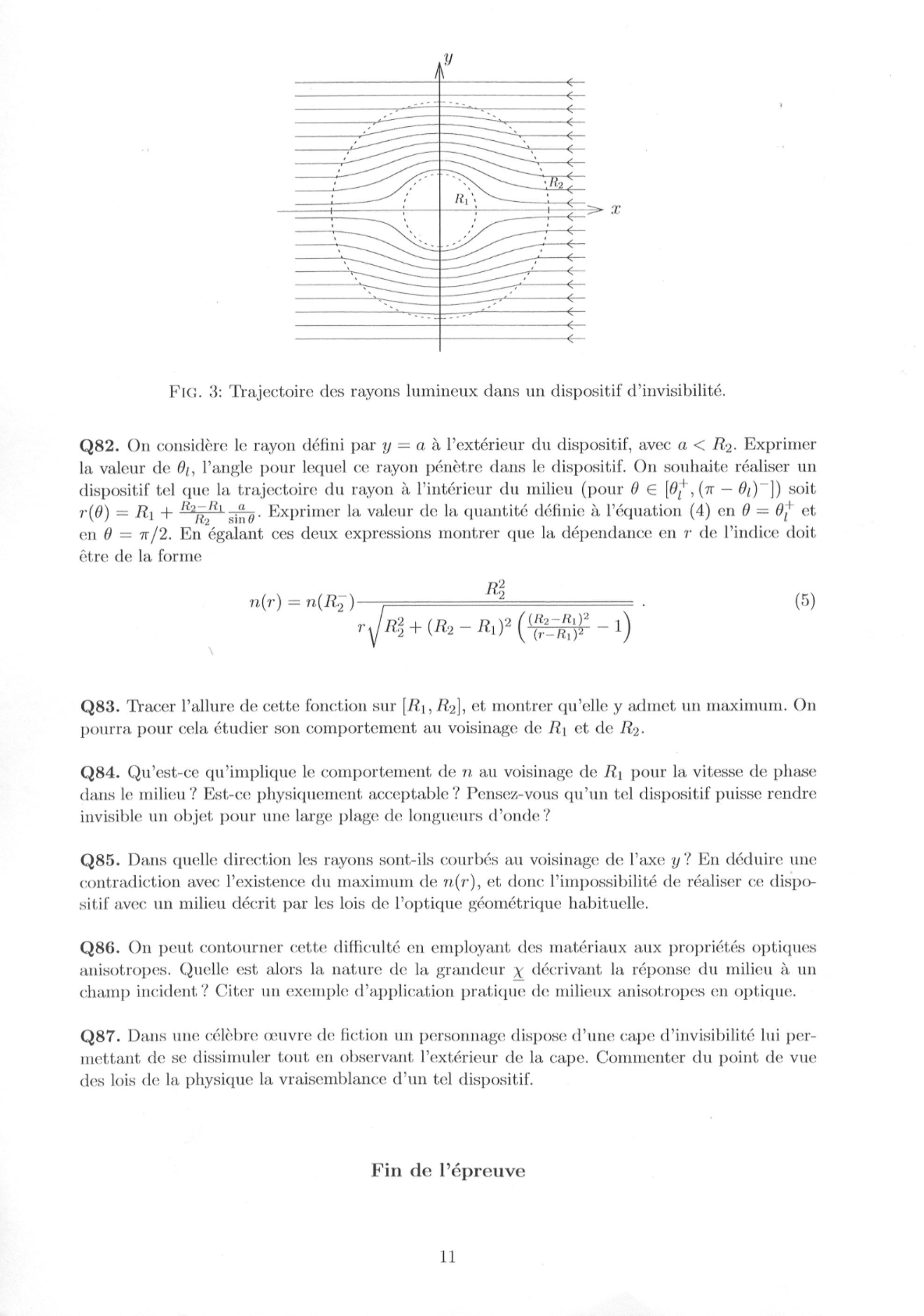 Q82. On considère le rayon défini par à l'extérieur du dispositif, avec . Exprimer la valeur de , l'angle pour lequel ce rayon pénètre dans le dispositif. On souhaite réaliser un dispositif tel que la trajectoire du rayon à l'intérieur du milieu (pour ) soit . Exprimer la valeur de la quantité définie à l'équation (4) en et en . En égalant ces deux expressions montrer que la dépendance en de l'indice doit être de la forme