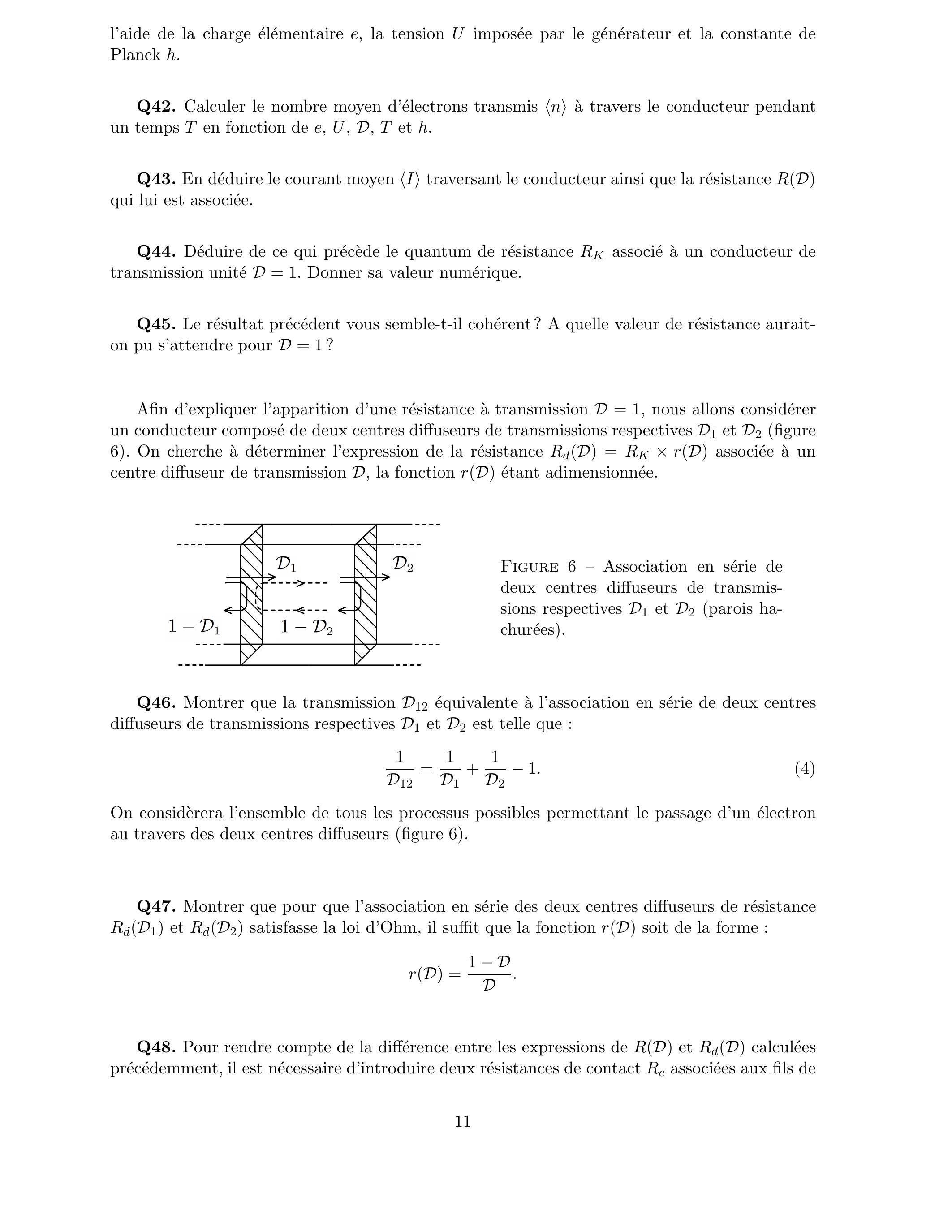 Q44. Déduire de ce qui précède le quantum de résistance associé à un conducteur de transmission unité . Donner sa valeur numérique.