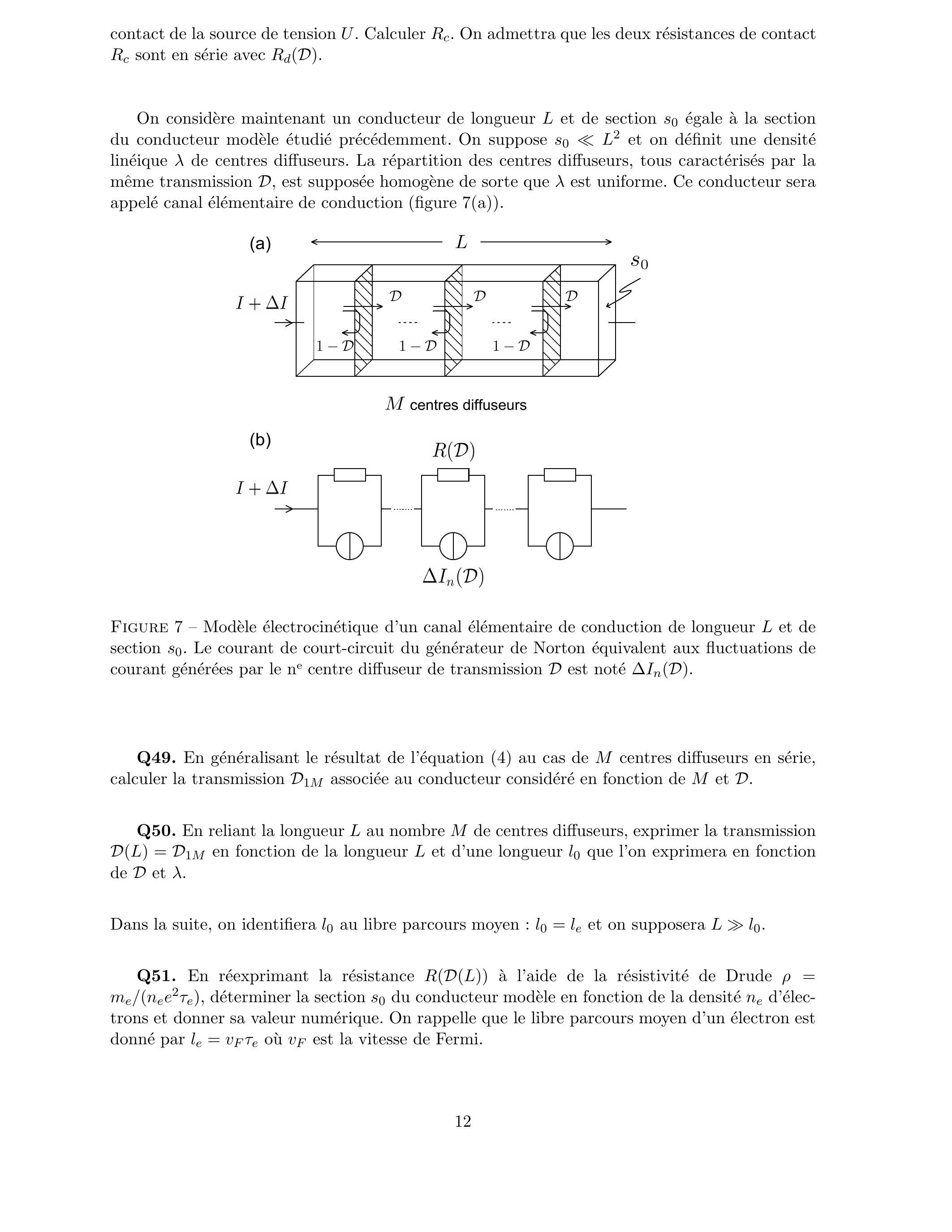 Q49. En généralisant le résultat de l'équation (4) au cas de centres diffuseurs en série, calculer la transmission associée au conducteur considéré en fonction de et .