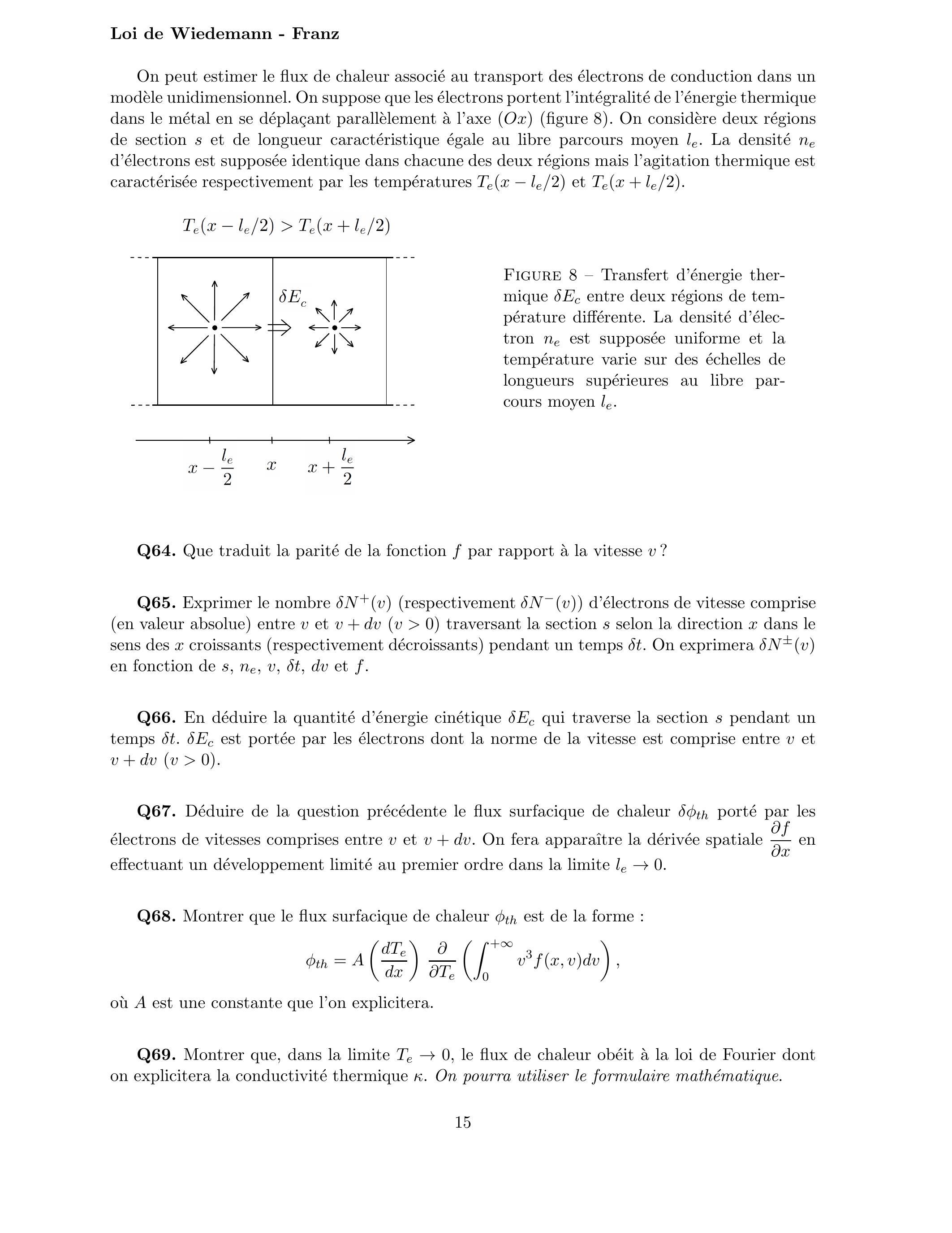 Q67. Déduire de la question précédente le flux surfacique de chaleur porté par les électrons de vitesses comprises entre et . On fera apparaître la dérivée spatiale en effectuant un développement limité au premier ordre dans la limite .