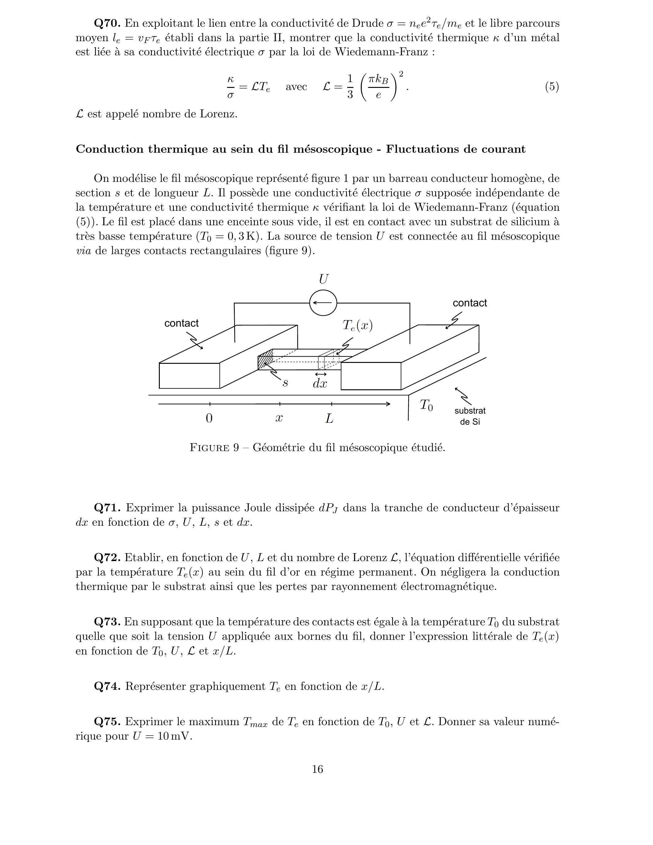 Q91. D'après la partie IV, les fluctuations d'intensité résultent de l'élévation de température par effet Joule du fil mésoscopique. En régime stationnaire, la puissance fournie par la source de courant contre-balance exactement les pertes par conduction thermiques qui permettent d'évacuer la puissance Joule :