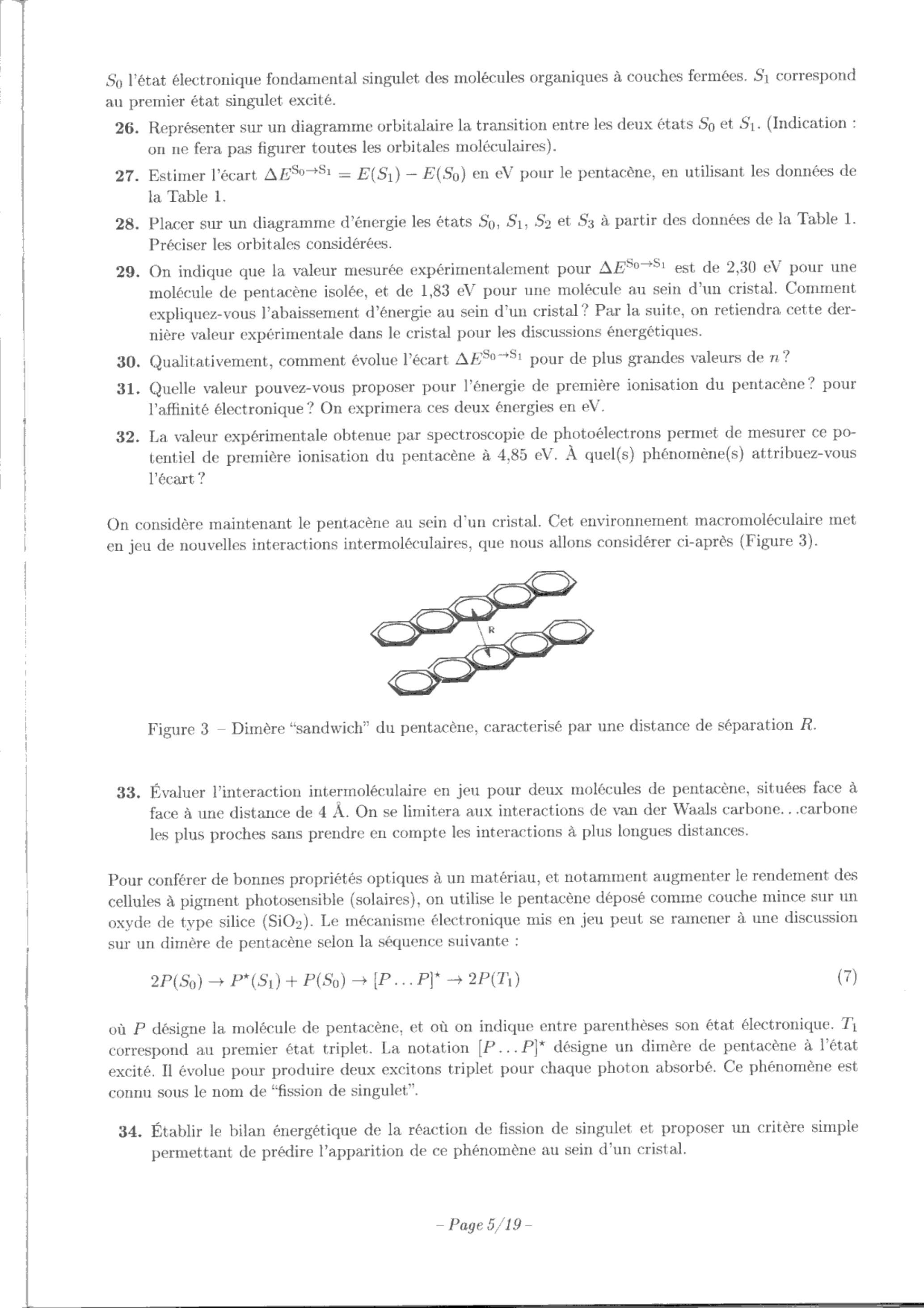 29. On indique que la valeur mesurée expérimentalement pour est de pour une molécule de pentacène isolée, et de pour une molécule au sein d'un cristal. Comment expliquez-vous l'abaissement d'énergie au sein d'un cristal? Par la suite, on retiendra cette dernière valeur expérimentale dans le cristal pour les discussions énergétiques.