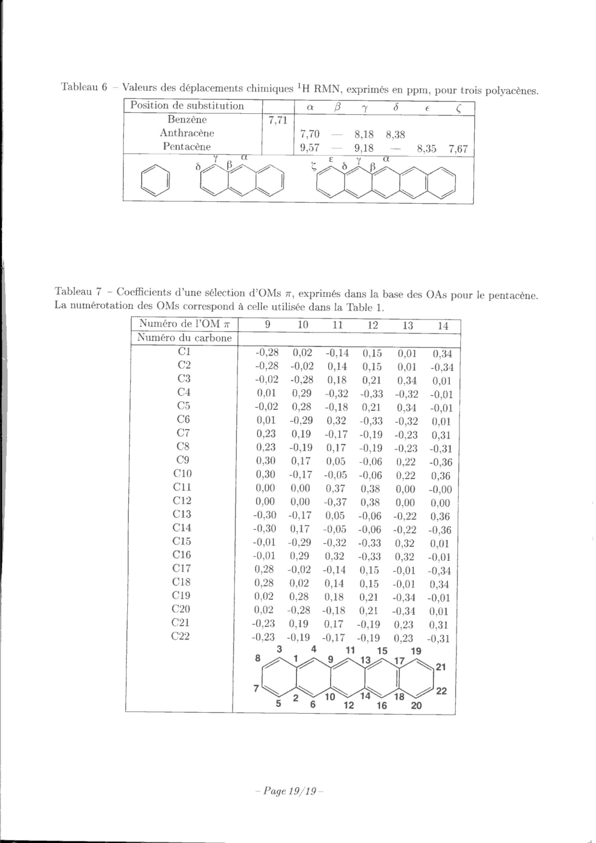 Tableau 6 - Valeurs des déplacements chimiques , exprimés en ppm, pour trois polyacènes.
