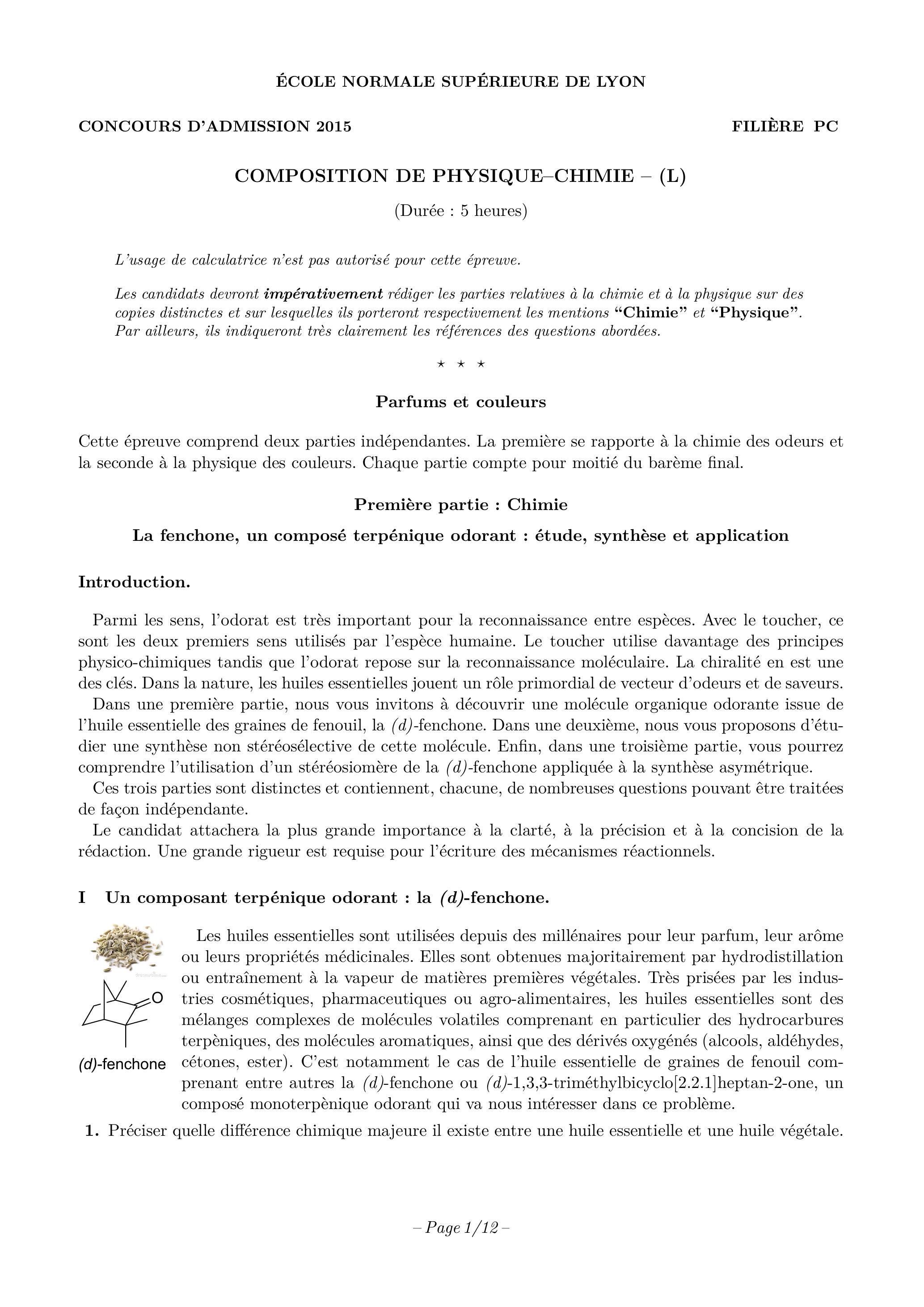 Cette épreuve comprend deux parties indépendantes. La première se rapporte à la chimie des odeurs et la seconde à la physique des couleurs. Chaque partie compte pour moitié du barème final.