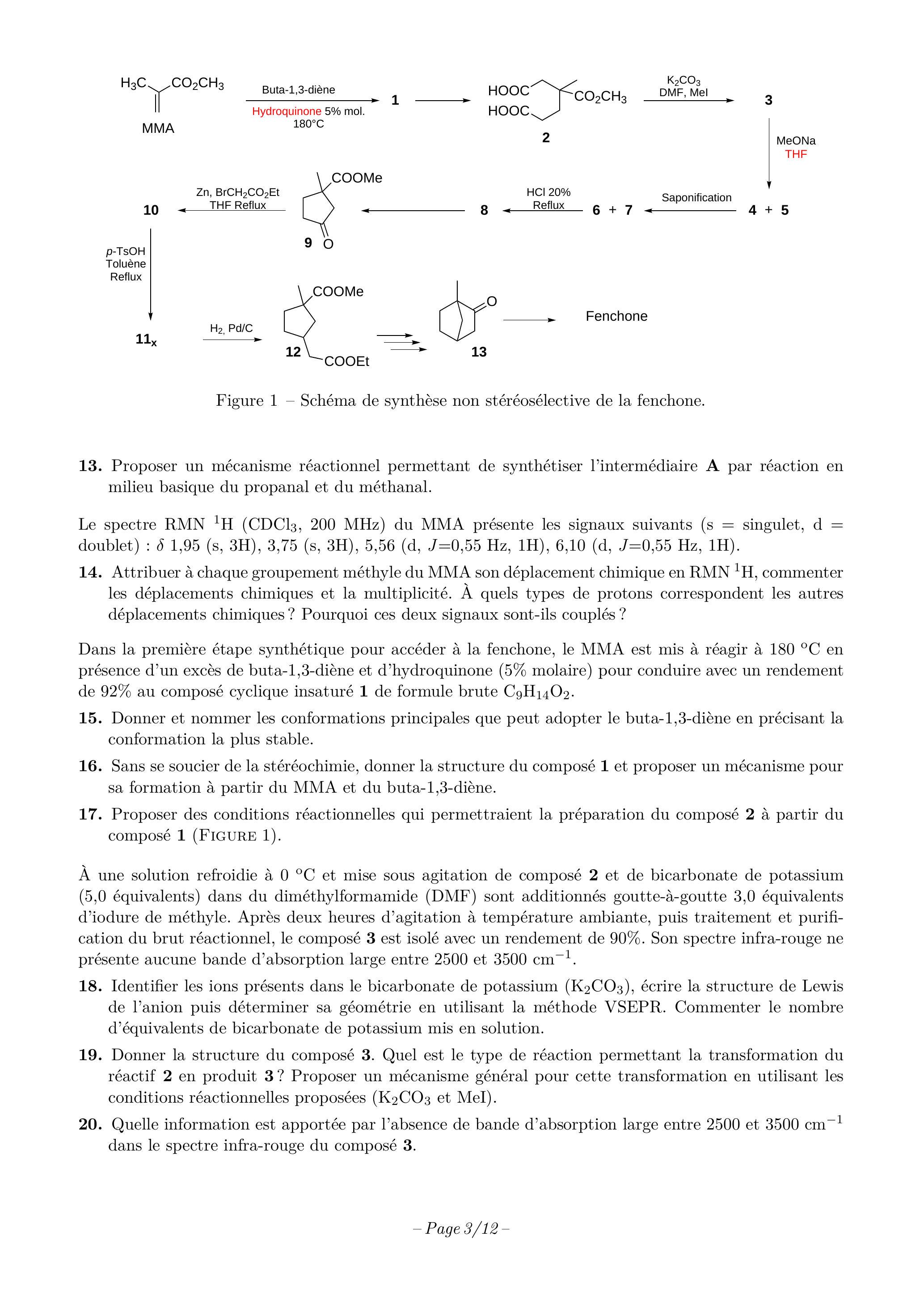 Si la fenchone, comme d'autres composés naturels, peut être obtenue à partir d'une huile essentielle, le faible rendement obtenu n'est pas intéressant d'un point de vue industriel. Une méthode plus efficace et moins onéreuse pour une production à grande échelle est le développement d'une voie synthétique. Ainsi, nous nous intéresserons dans une seconde partie à la synthèse non stéréosélective de la fenchone (Figure 1). À ce titre, aucune stéréochimie ou configuration absolue des composés 1-13 n'est demandée.
