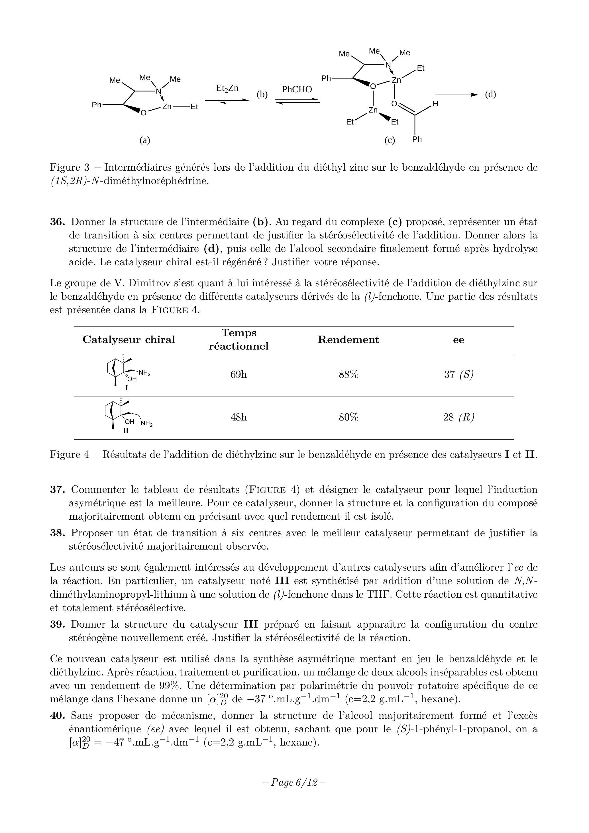 33. Définir les termes "excès énantiomèrique" et "catalyseur chiral". En absence de catalyseur chiral, donner la structure des différents alcools secondaires pouvant être formés par réaction entre le benzaldéhyde et le diéthylzinc en précisant leur configuration.