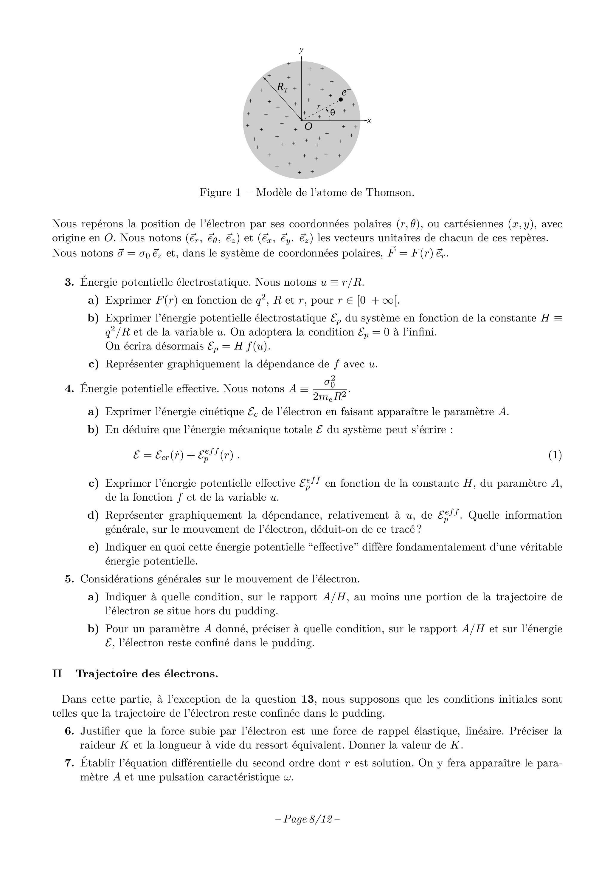 Des charges positives immobiles sont uniformément réparties à l'intérieur d'une boule de rayon et de centre (voir figure 1). L'électron ( ), de vecteur position , se déplace dans le champ électrique créé par ces charges positives, à l'intérieur comme à l'extérieur du pudding. Nous négligeons toute autre forme d'interaction.
