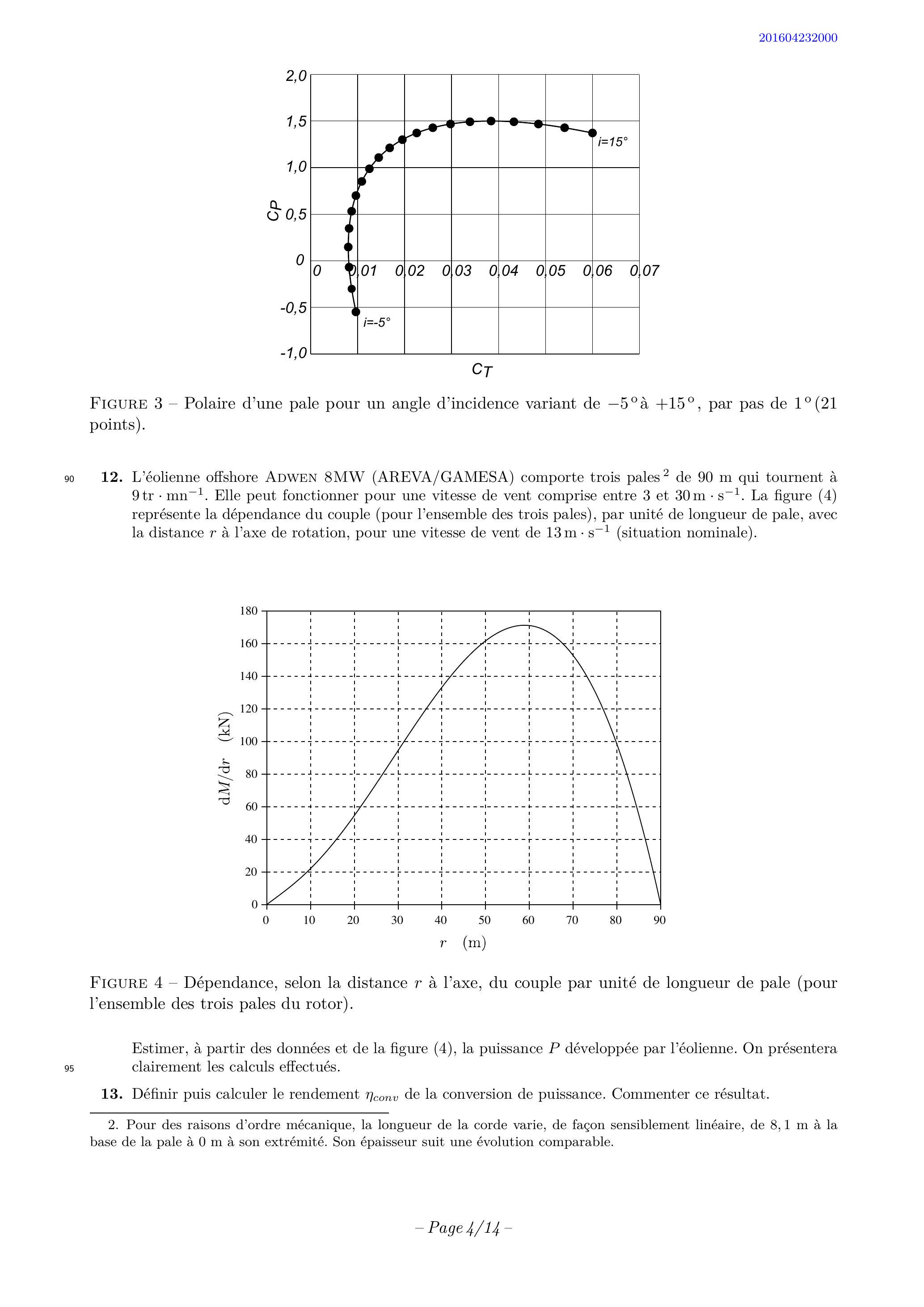 L'éolienne offshore Adwen 8MW (AREVA/GAMESA) comporte trois pales de 90 m qui tournent à . Elle peut fonctionner pour une vitesse de vent comprise entre 3 et . La figure (4) représente la dépendance du couple (pour l'ensemble des trois pales), par unité de longueur de pale, avec la distance à l'axe de rotation, pour une vitesse de vent de (situation nominale).