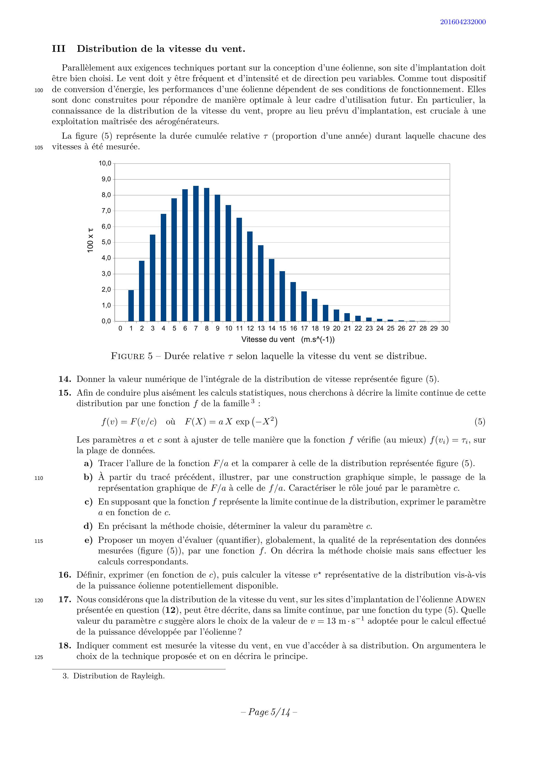 17. Nous considérons que la distribution de la vitesse du vent, sur les sites d'implantation de l'éolienne Adwen présentée en question (12), peut être décrite, dans sa limite continue, par une fonction du type (5). Quelle valeur du paramètre suggère alors le choix de la valeur de adoptée pour le calcul effectué de la puissance développée par l'éolienne?