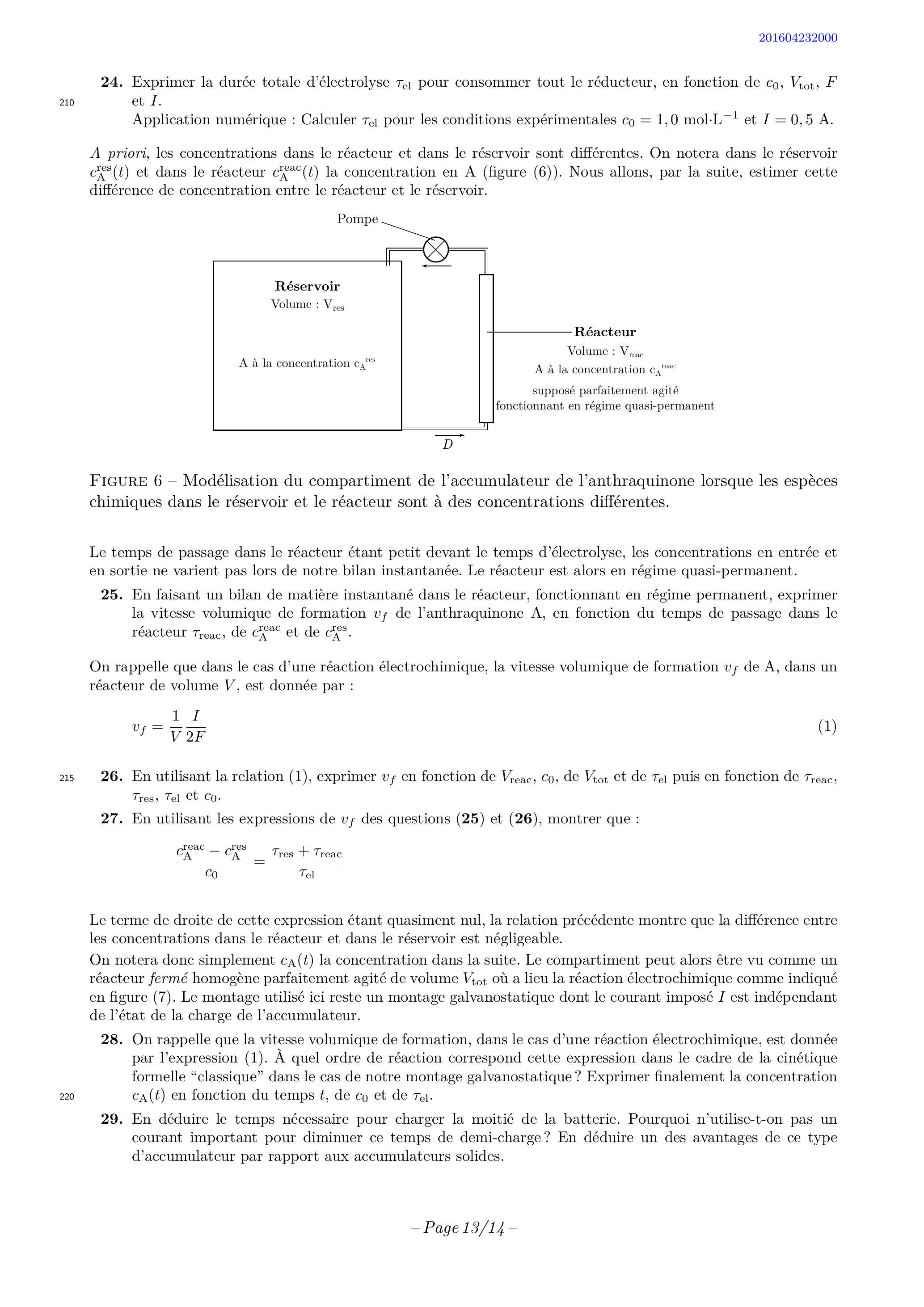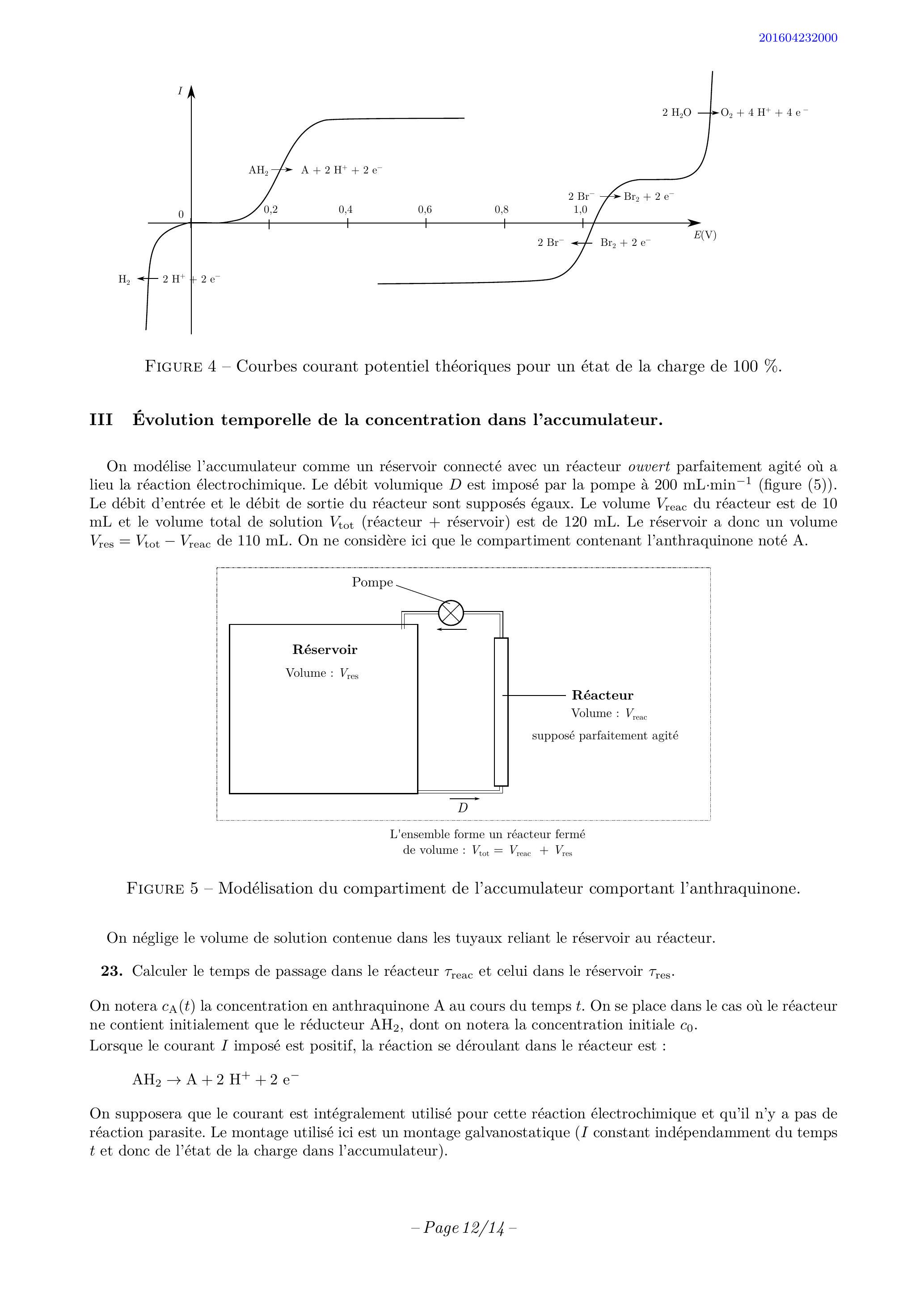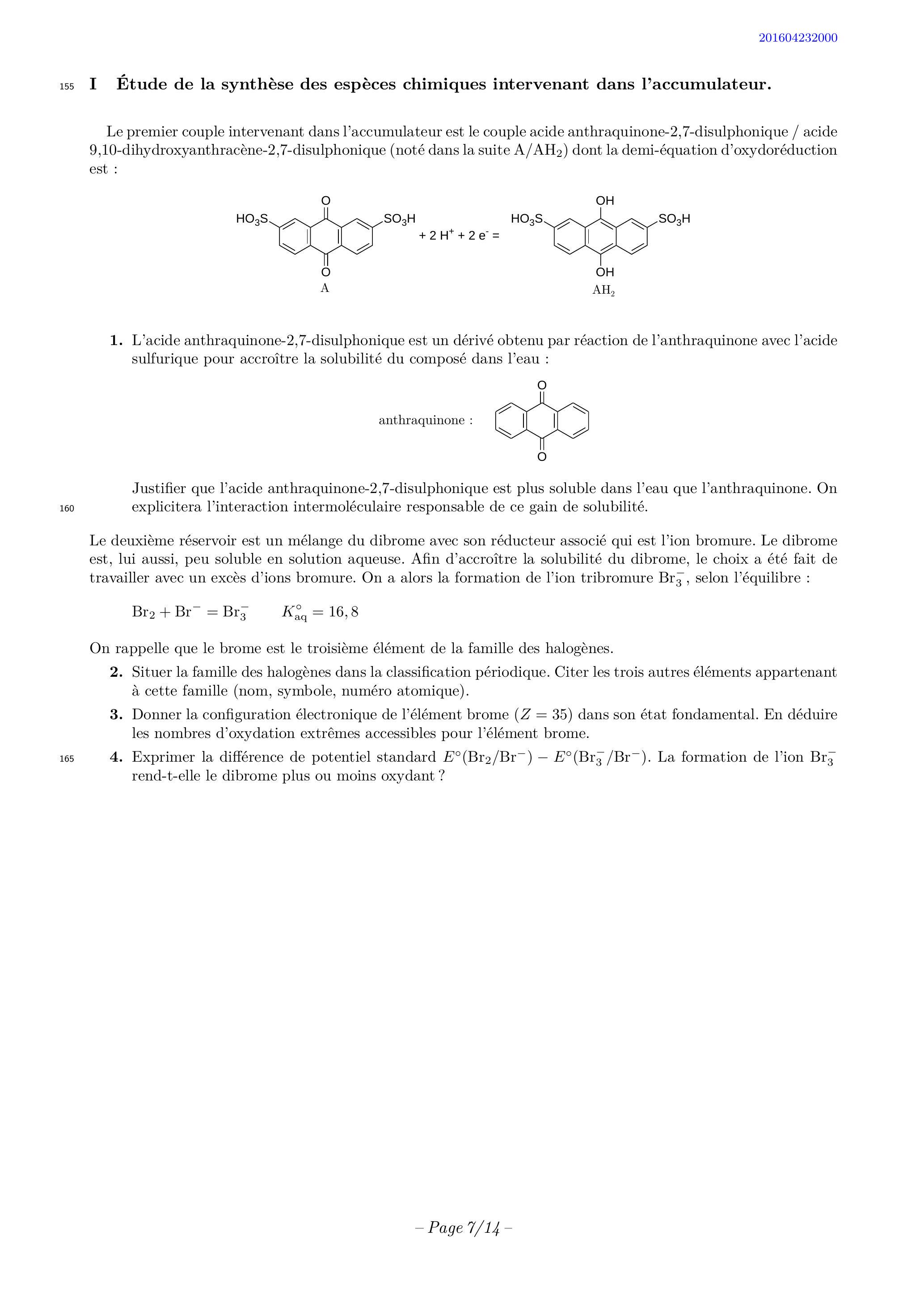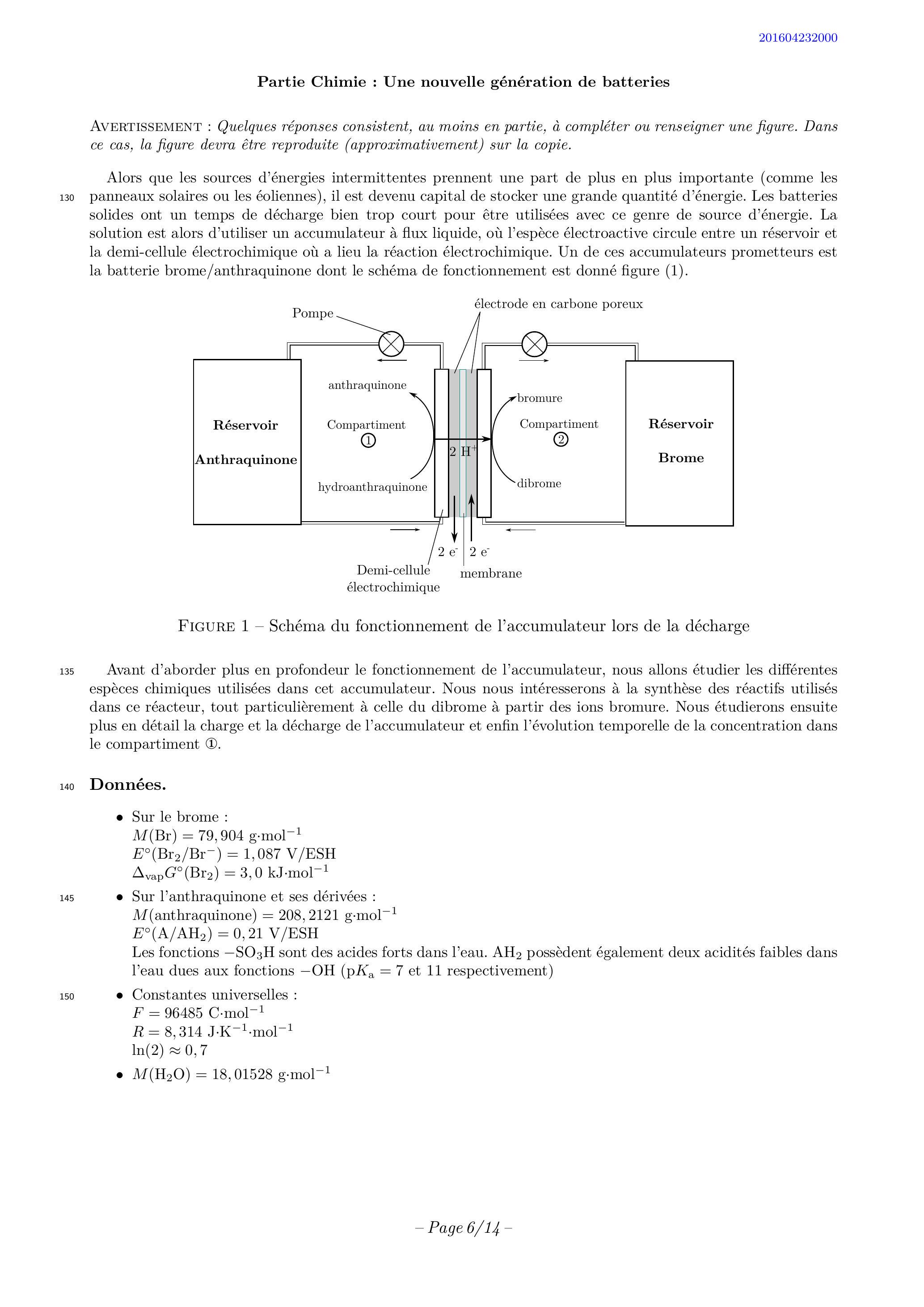 Le compartiment (1) est initialement rempli d'une solution d'anthraquinone A à la concentration et le compartiment (2) est rempli d'un mélange de HBr à la concentration et à . On rappelle que les deux couples d'oxydoréduction intervenant dans cet accumulateur sont et .