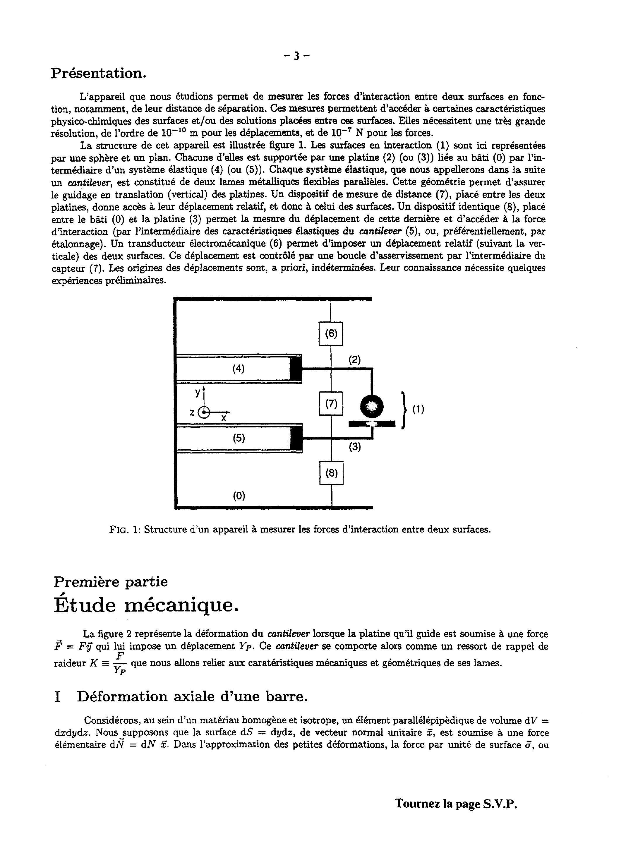 L'appareil que nous étudions permet de mesurer les forces d'interaction entre deux surfaces en fonction, notamment, de leur distance de séparation. Ces mesures permettent d'accéder à certaines caractéristiques physico-chimiques des surfaces et/ou des solutions placées entre ces surfaces. Elles nécessitent une très grande résolution, de l'ordre de pour les déplacements, et de pour les forces.