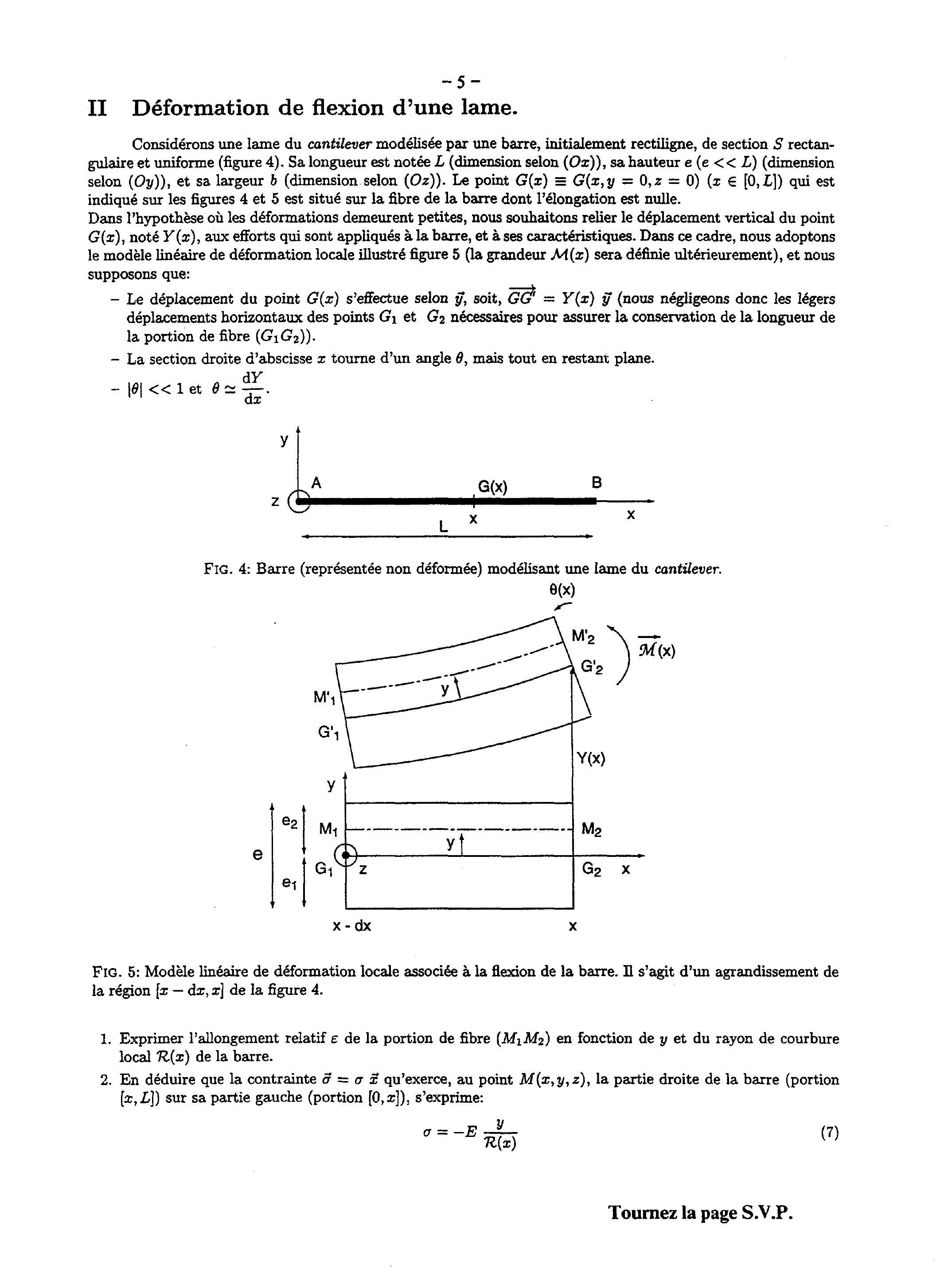 Considérons une lame du cantilever modélisée par une barre, initialement rectiligne, de section rectangulaire et uniforme (figure 4). Sa longueur est notée (dimension selon ( )), sa hauteur ( ) (dimension selon ( )), et sa largeur (dimension selon ( )). Le point qui est indiqué sur les figures 4 et 5 est situé sur la fibre de la barre dont l'élongation est nulle.