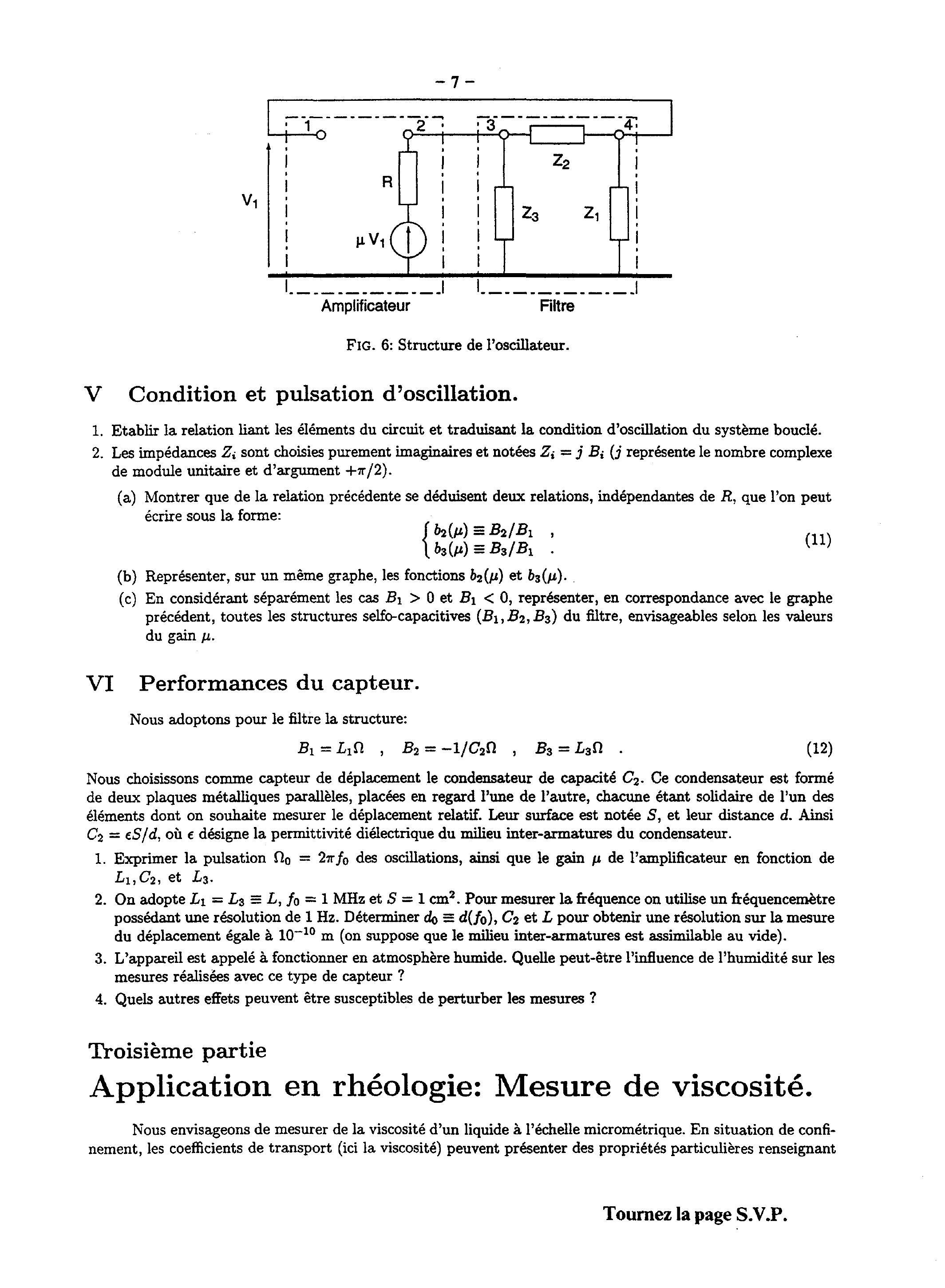 La mesure des déplacements met en œuvre un oscillateur électrique dont l'un des éléments fixant sa fréquence est sensible au déplacement. La structure simplifiée d'un tel oscillateur est représentée figure 6. L'amplificateur possède un gain en tension (à vide) noté (supposé réel), une résistance de sortie , et une résistance d'entrée (non représentée) que nous supposons infinie. Sa sortie (2) est connectée à un filtre constitué par le pont d'impédances complexes ( ). La sortie (4) du filtre est reliée à l'entrée (1) de l'amplificateur. Nous supposons que cet oscillateur fonctionne en régime harmonique à la pulsation .