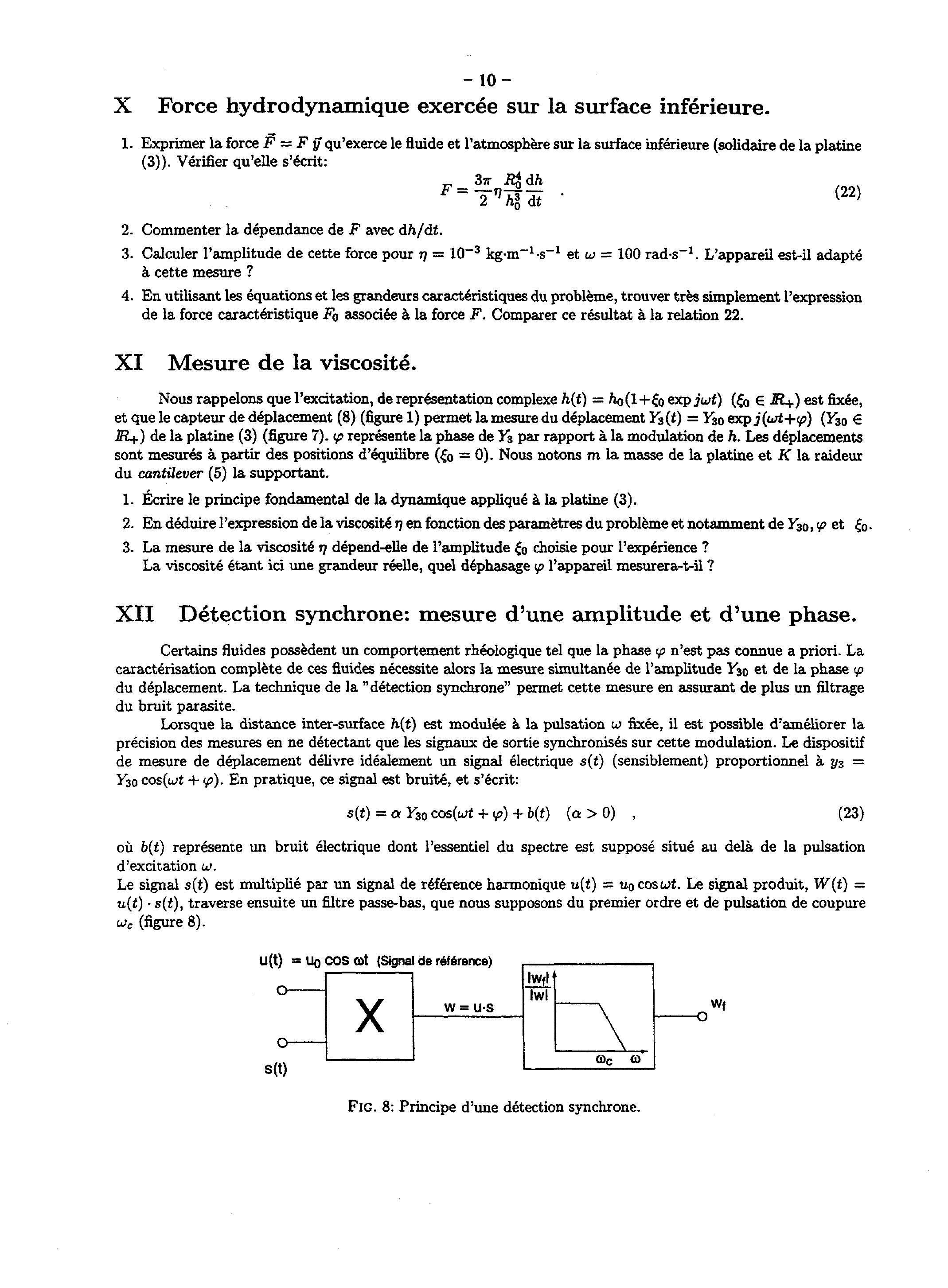 Certains fluides possèdent un comportement rhéologique tel que la phase n'est pas connue a priori. La caractérisation complète de ces fluides nécessite alors la mesure simultanée de l'amplitude et de la phase du déplacement. La technique de la "détection synchrone" permet cette mesure en assurant de plus un filtrage du bruit parasite.