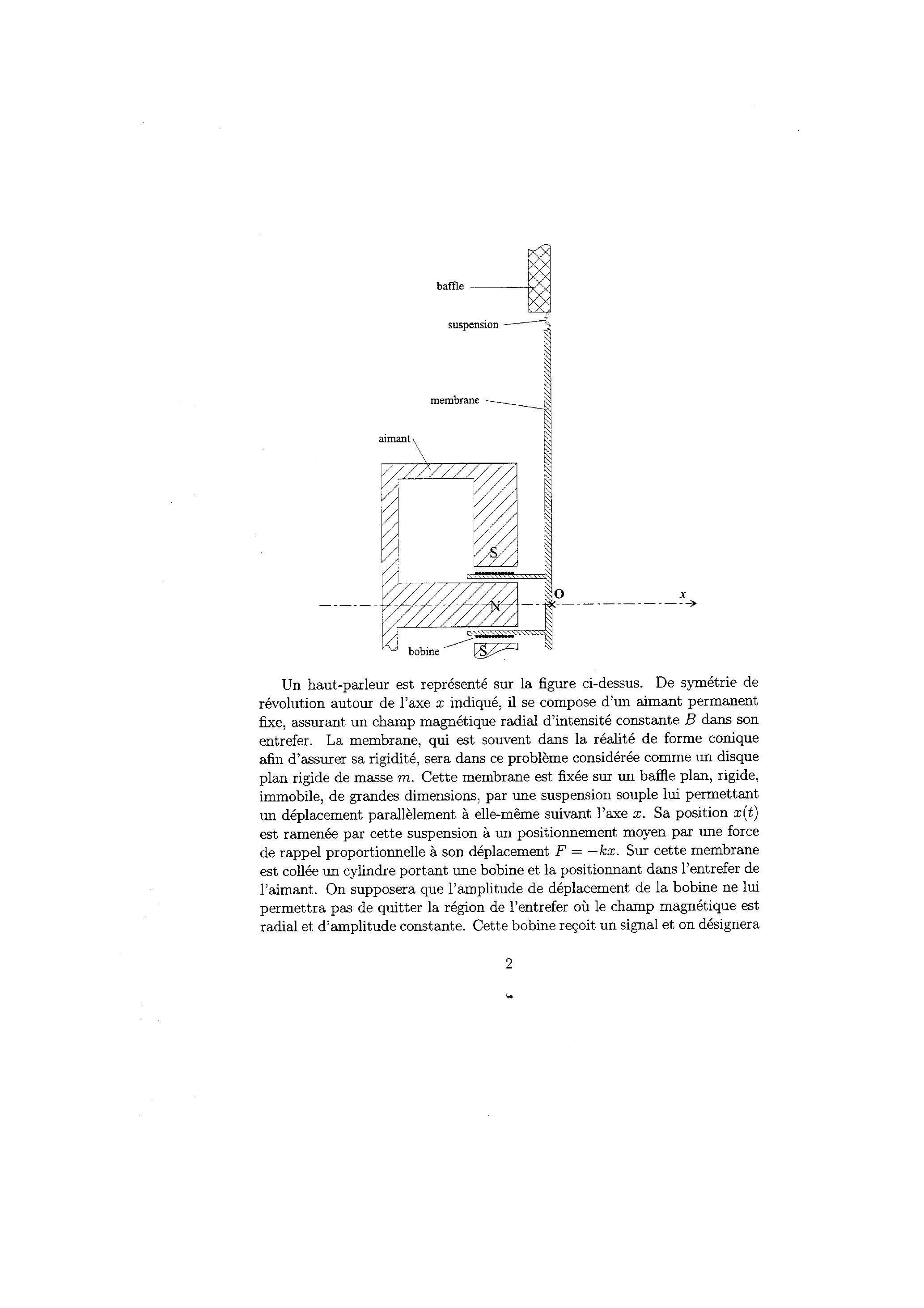 Un haut-parleur est représenté sur la figure ci-dessus. De symétrie de révolution autour de l'axe indiqué, il se compose d'un aimant permanent fixe, assurant un champ magnétique radial d'intensité constante dans son entrefer. La membrane, qui est souvent dans la réalité de forme conique afin d'assurer sa rigidité, sera dans ce problème considérée comme un disque plan rigide de masse . Cette membrane est fixée sur un baffle plan, rigide, immobile, de grandes dimensions, par une suspension souple lui permettant un déplacement parallèlement à elle-même suivant l'axe . Sa position est ramenée par cette suspension à un positionnement moyen par une force de rappel proportionnelle à son déplacement . Sur cette membrane est collée un cylindre portant une bobine et la positionnant dans l'entrefer de l'aimant. On supposera que l'amplitude de déplacement de la bobine ne lui permettra pas de quitter la région de l'entrefer où le champ magnétique est radial et d'amplitude constante. Cette bobine reçoit un signal et on désignera