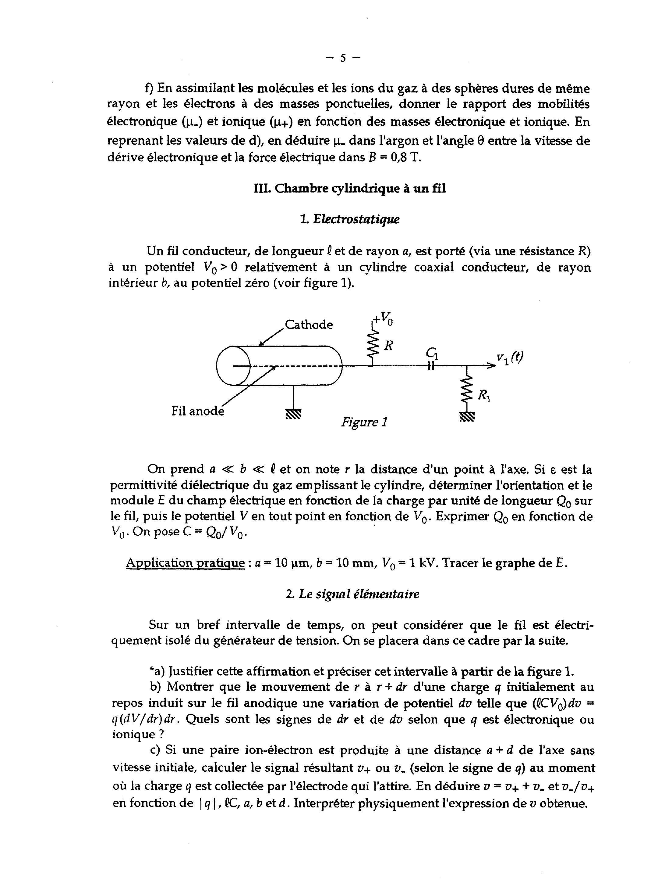 En 1992, le physicien français Georges Charpak a reçu le prix Nobel de physique «pour l'invention et le développement de détecteurs de particules, en particulier la chambre proportionnelle à fils multiples . Le problème se propose d'étudier certains aspects des chambres à fils employées pour la détection de particules de haute énergie et dont il existe des variantes adaptées à l'imagerie médicale. La détection repose sur les propriétés ionisantes des particules, introduites dans la partie I. L'effet d'un champ magnétique sur le transport d'une particule chargée fait l'objet de la partie II. La partie III est consacrée à la chambre cylindrique à un fil, dont le principe est repris dans la chambre à fils multiples (partie IV).