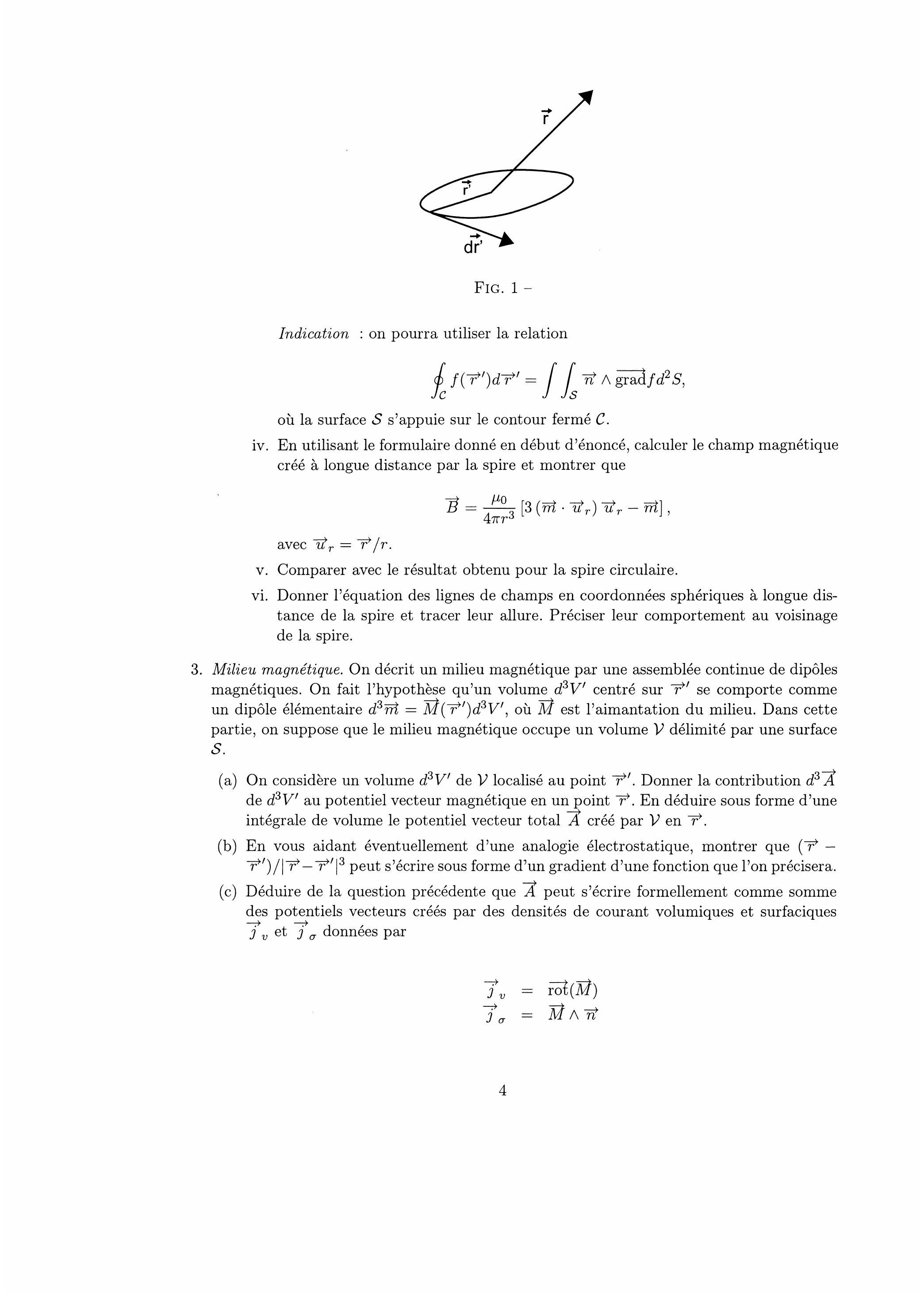 3. Milieu magnétique. On décrit un milieu magnétique par une assemblée continue de dipôles magnétiques. On fait l'hypothèse qu'un volume centré sur se comporte comme un dipôle élémentaire , où est l'aimantation du milieu. Dans cette partie, on suppose que le milieu magnétique occupe un volume délimité par une surface .
