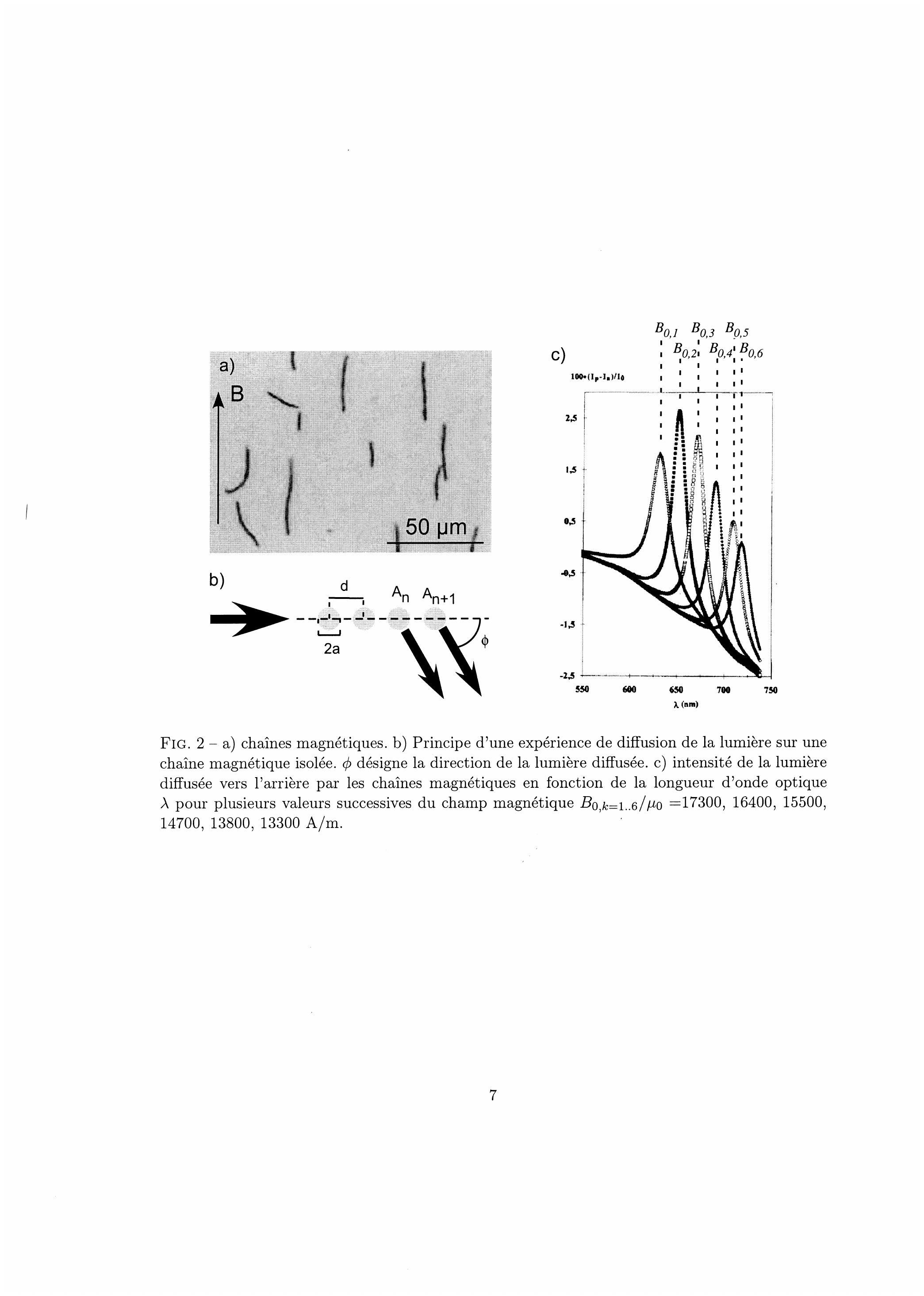 Fig. 2 - a) chaînes magnétiques. b) Principe d'une expérience de diffusion de la lumière sur une chaîne magnétique isolée. désigne la direction de la lumière diffusée. c) intensité de la lumière diffusée vers l'arrière par les chaînes magnétiques en fonction de la longueur d'onde optique pour plusieurs valeurs successives du champ magnétique , .