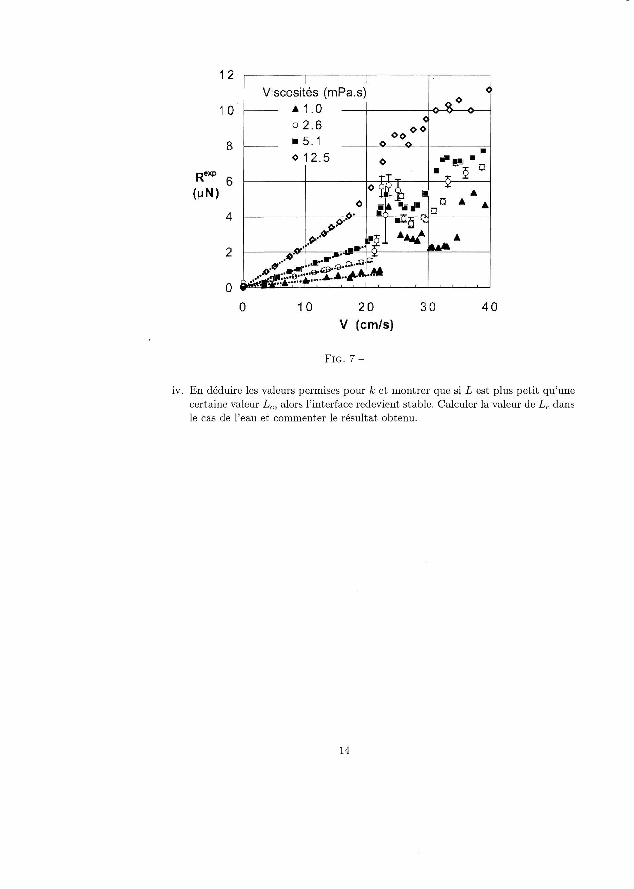 vi. La figure 7 représente le résultat de mesure de la force parallèle à la direction du mouvement (traînée) pour un fil de taille affleurant à la surface de mélanges eau-glycérol ( ) de viscosité dynamique variable ( ).