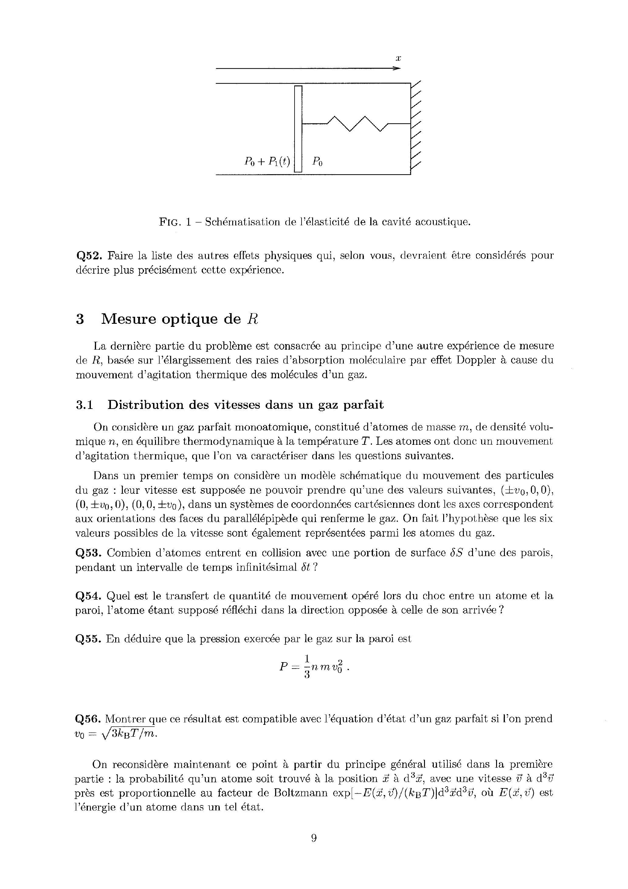 Le problème est constitué de trois parties largement indépendantes. La première se décompose en deux exercices eux aussi indépendants, qui présentent deux illustrations des principes microscopiques de la thermodynamique. Les deux parties suivantes sont consacrées à deux méthodes distinctes de mesure de la constante des gaz parfaits.