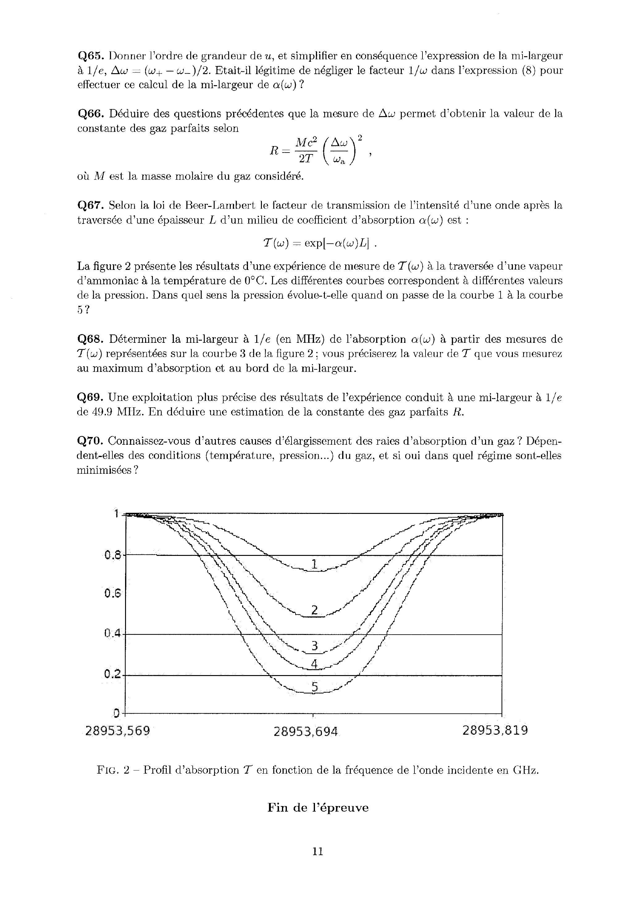Q68. Déterminer la mi-largeur à en MHz de l'absorption à partir des mesures de représentées sur la courbe 3 de la figure 2 ; vous préciserez la valeur de que vous mesurez au maximum d'absorption et au bord de la mi-largeur.