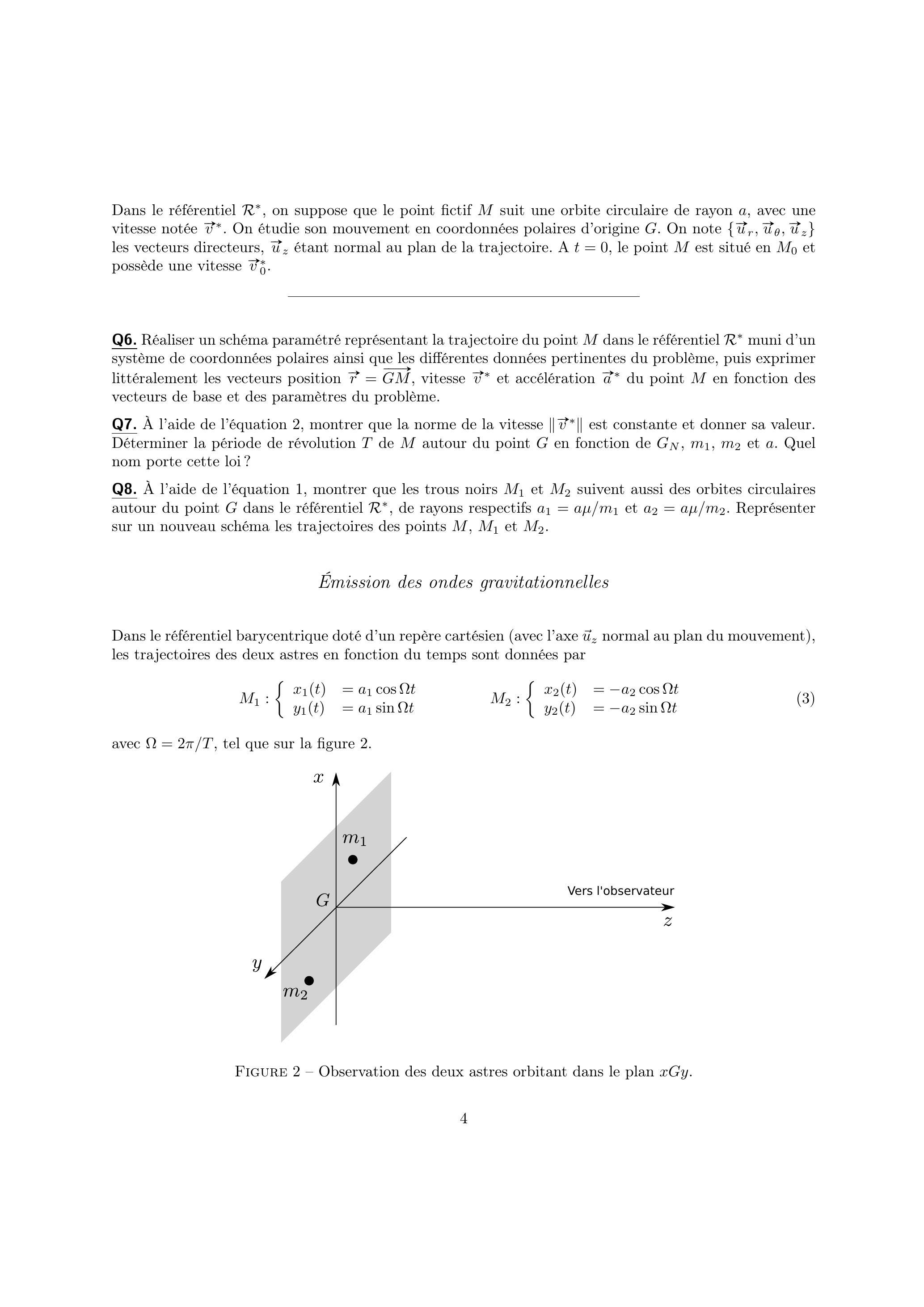 Q15. L'énergie mécanique totale du système binaire n'est pas conservée. Elle diminue et sa variation est égale à la puissance rayonnée par ondes gravitationnelles. À l'aide du théorème de l'énergie mécanique, établir l'équation différentielle donnant l'évolution de et la résoudre. On notera la condition initiale à un temps arbitraire . Commenter la solution. Qualitativement, à l'aide de la question Q10 expliquer comment évolue alors l'amplitude de au cours du temps.