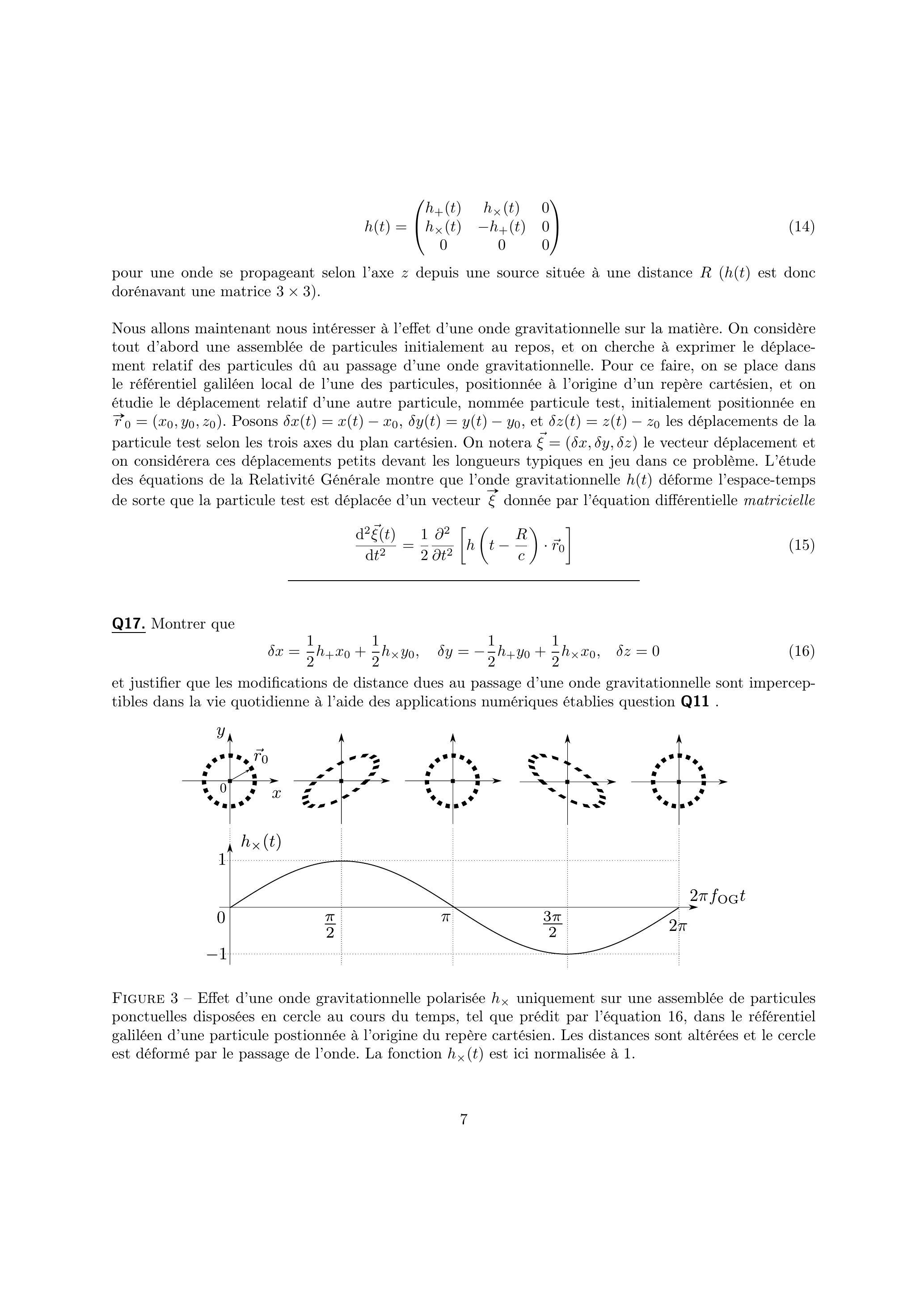 Q19. On aimerait supposer que l'on peut négliger le déplacement des miroirs dû au passage de l'onde gravitationnelle pendant que la lumière réalise un aller-retour entre ceux-ci. Donner une condition sur pour que cette affirmation soit vraie si on suppose que l'onde gravitationnelle a été générée par le système binaire de trous noirs étudié en première partie. Commenter la faisabilité d'un détecteur à miroirs fondé sur la mesure d'un temps d'aller-retour de la lumière installé sur Terre ou dans l'espace.