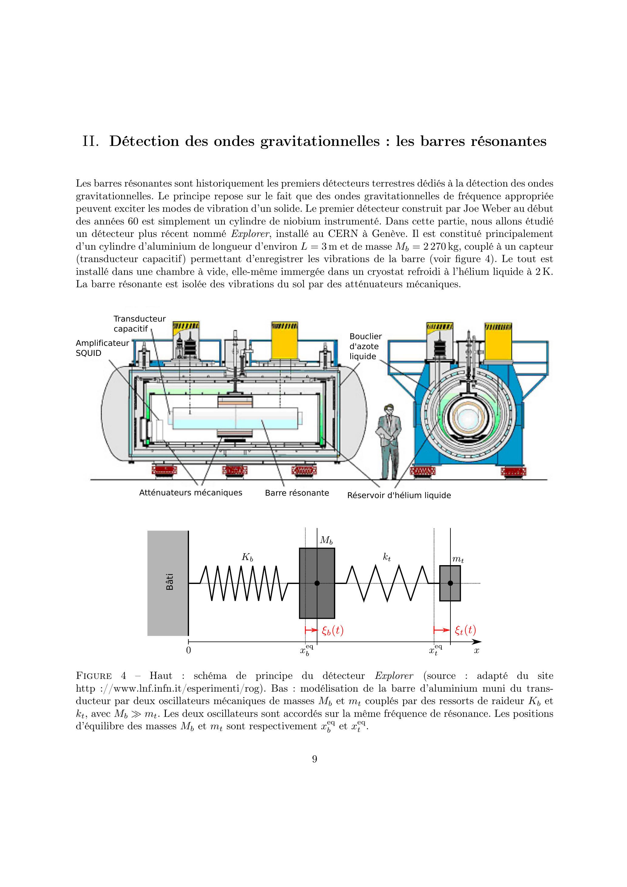 Les barres résonantes sont historiquement les premiers détecteurs terrestres dédiés à la détection des ondes gravitationnelles. Le principe repose sur le fait que des ondes gravitationnelles de fréquence appropriée peuvent exciter les modes de vibration d'un solide. Le premier détecteur construit par Joe Weber au début des années 60 est simplement un cylindre de niobium instrumenté. Dans cette partie, nous allons étudié un détecteur plus récent nommé Explorer, installé au CERN à Genève. Il est constitué principalement d'un cylindre d'aluminium de longueur d'environ et de masse , couplé à un capteur (transducteur capacitif) permettant d'enregistrer les vibrations de la barre (voir figure 4). Le tout est installé dans une chambre à vide, elle-même immergée dans un cryostat refroidi à l'hélium liquide à 2 K . La barre résonante est isolée des vibrations du sol par des atténuateurs mécaniques.