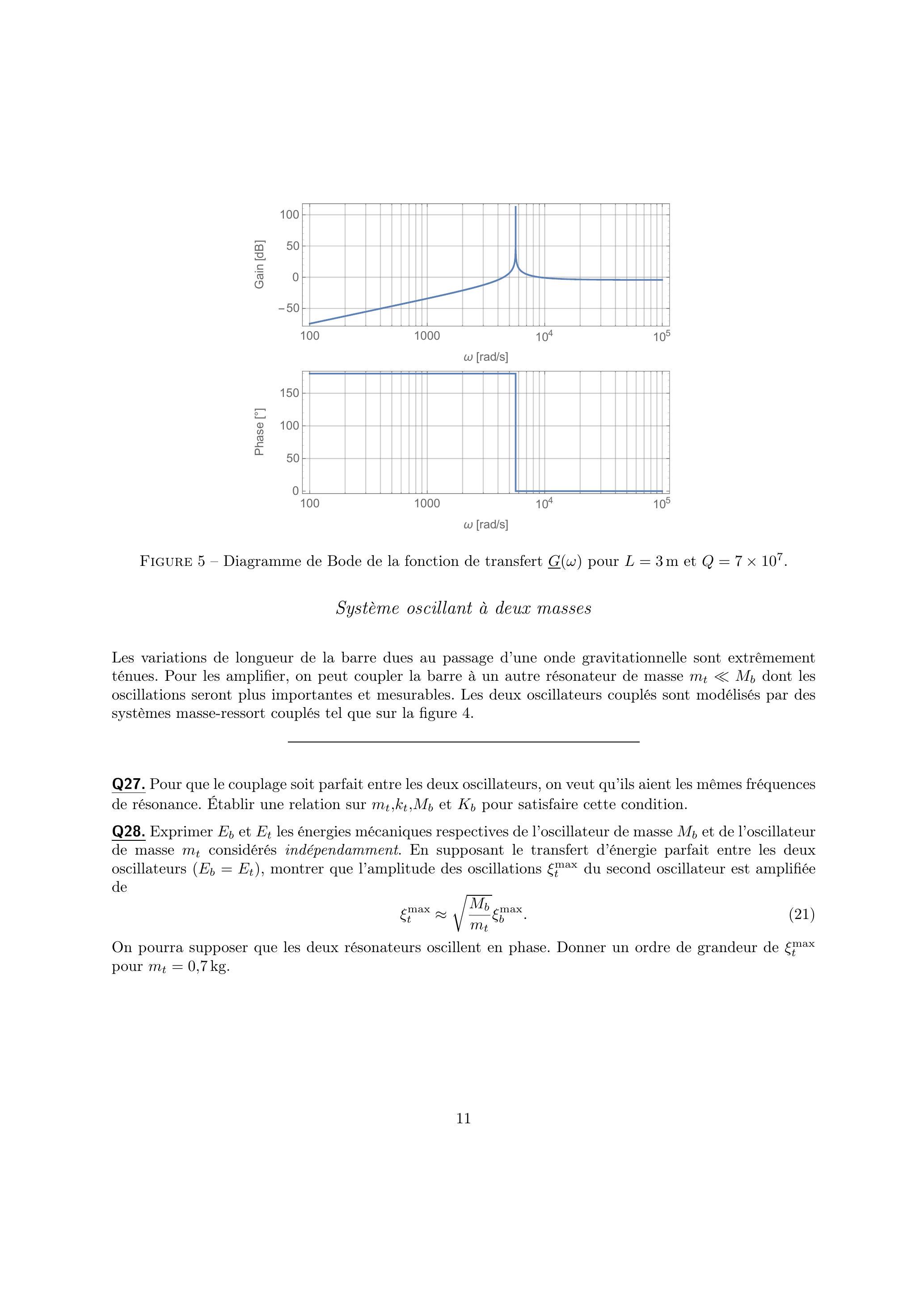 Q28. Exprimer et les énergies mécaniques respectives de l'oscillateur de masse et de l'oscillateur de masse considérés indépendamment. En supposant le transfert d'énergie parfait entre les deux oscillateurs ( ), montrer que l'amplitude des oscillations du second oscillateur est amplifiée de