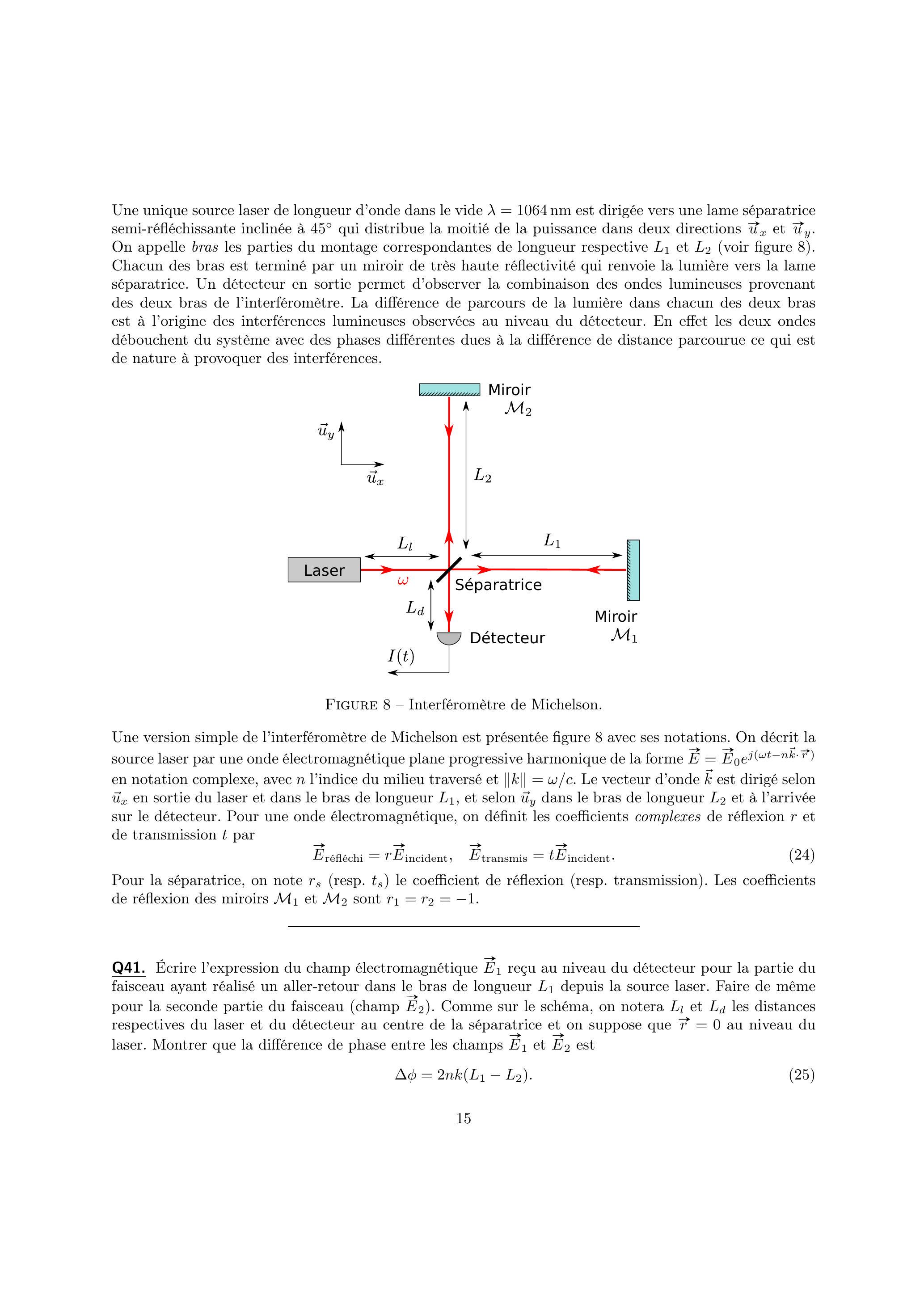 Une version simple de l'interféromètre de Michelson est présentée figure 8 avec ses notations. On décrit la source laser par une onde électromagnétique plane progressive harmonique de la forme en notation complexe, avec l'indice du milieu traversé et . Le vecteur d'onde est dirigé selon en sortie du laser et dans le bras de longueur , et selon dans le bras de longueur et à l'arrivée sur le détecteur. Pour une onde électromagnétique, on définit les coefficients complexes de réflexion et de transmission par