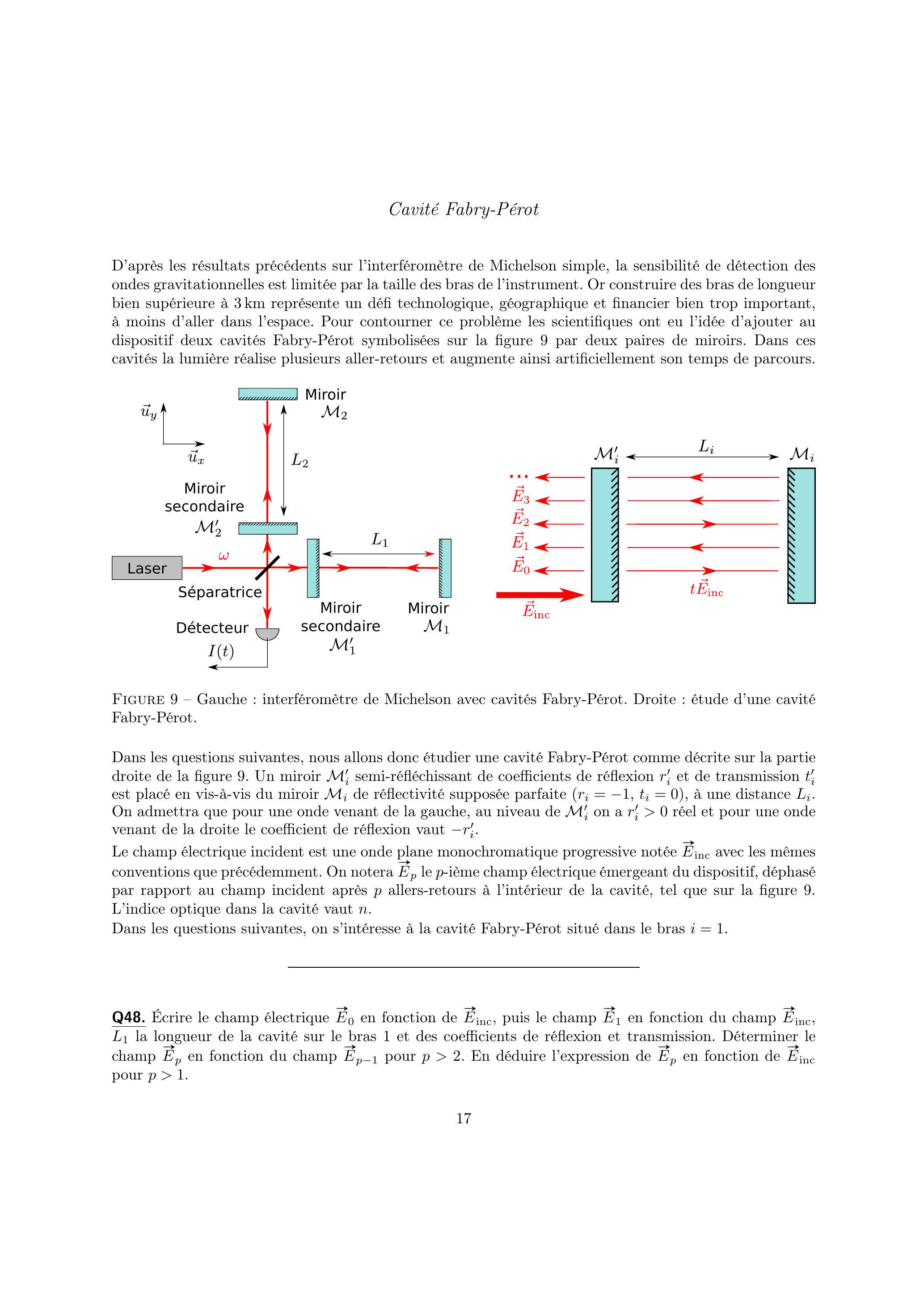 Q53. Pour l'interféromètre Virgo, . Donner un ordre de grandeur de . L'interféromètre de Michelson muni de deux cavités Fabry-Pérot se comporte comme un interféromètre simple mais avec une longueur de bras bien supérieure. Évaluer la longueur effective de ces bras.